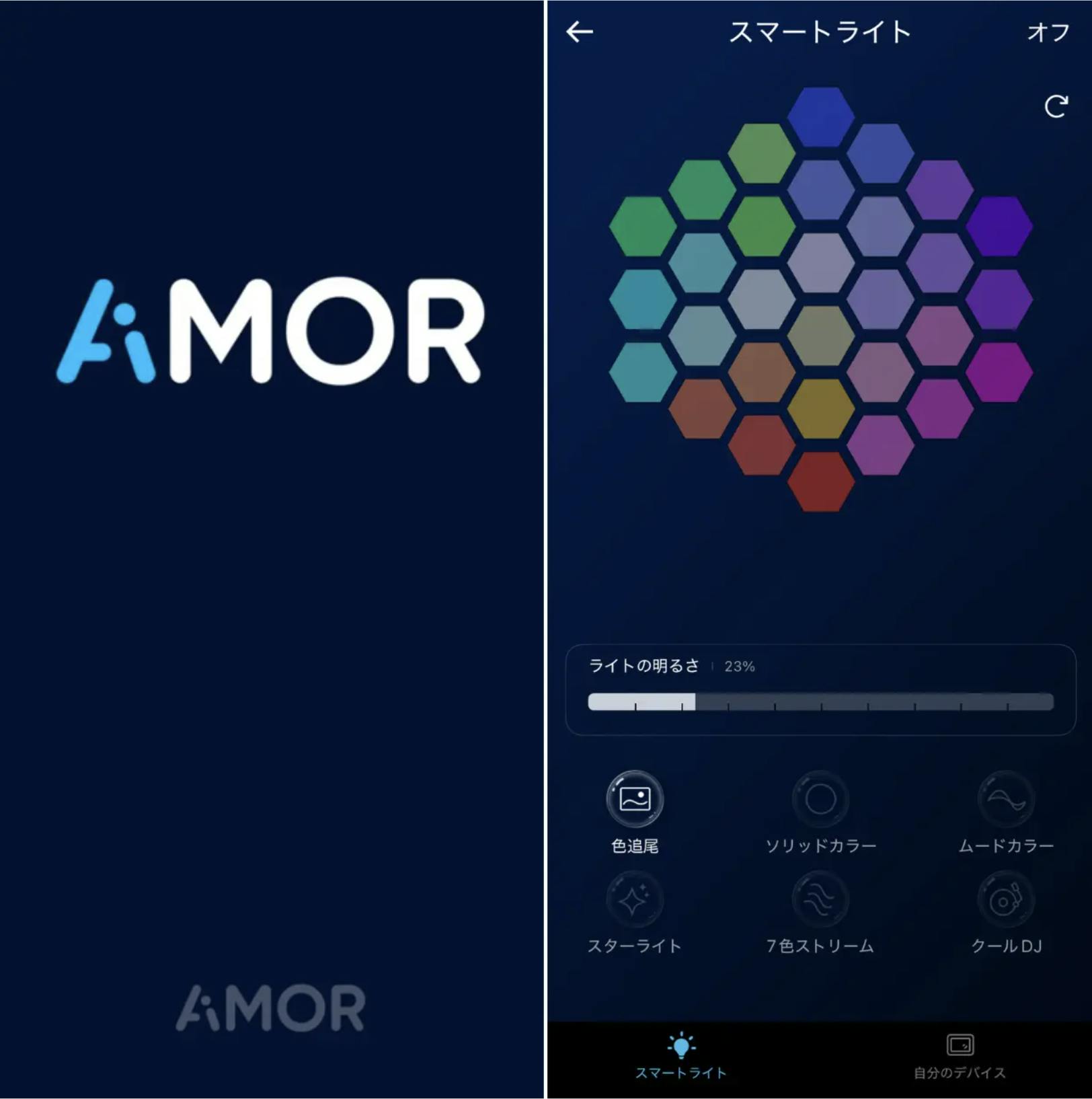 アンビエントライトは専用アプリ「AiMOR」で、お好みの色合いや明るさへのカスタマイズも簡単に。ライトを完全にオフにすることもできます。