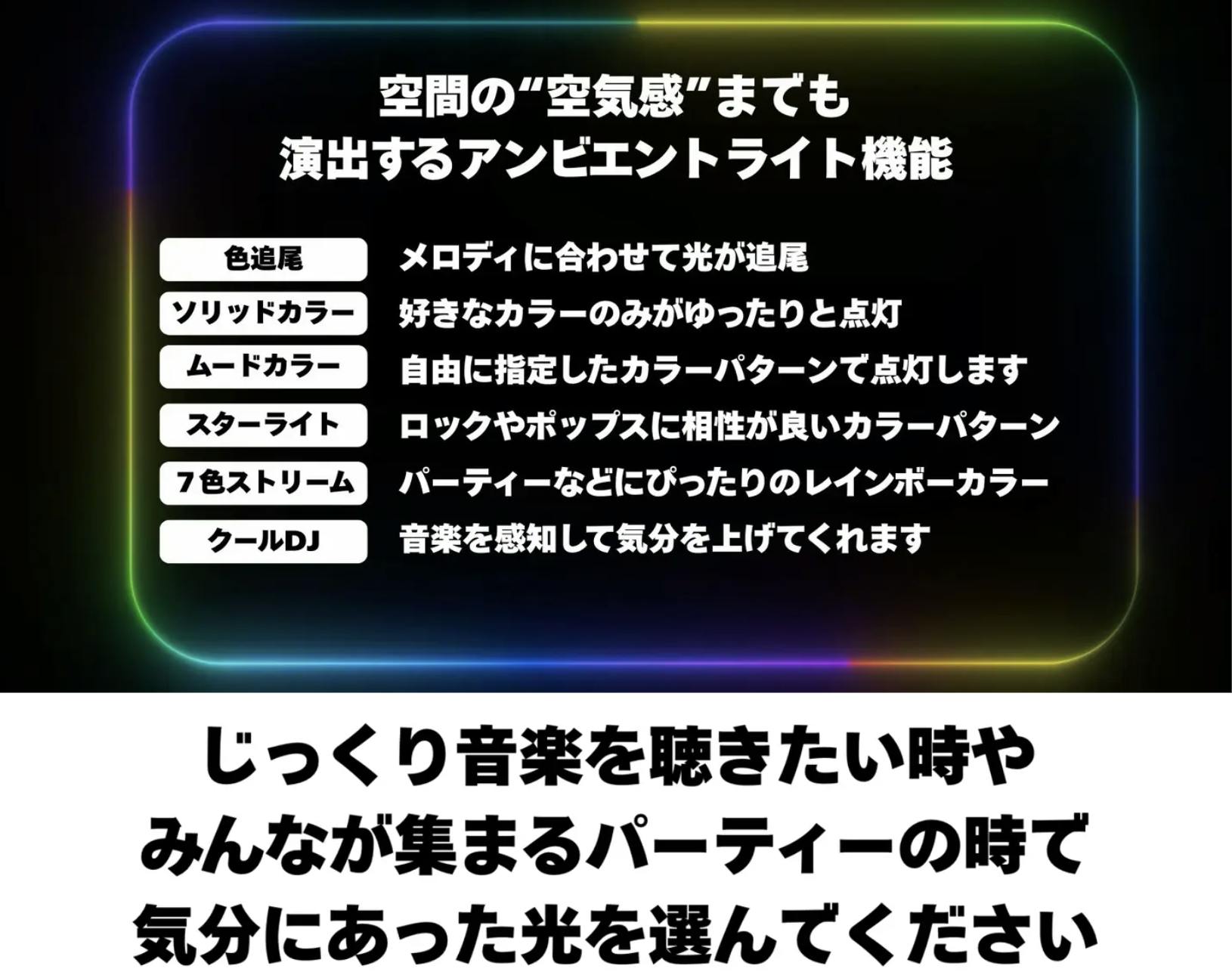 明滅や色調は繊細で、日常の邪魔をせず、インテリアに自然と溶け込む上質な設計。夜のくつろぎタイムには静かな光が包み込み、朝には穏やかな目覚めを演出。音とアートに寄り添う光が、あなたの暮らしに新しい“余韻”を加えます。