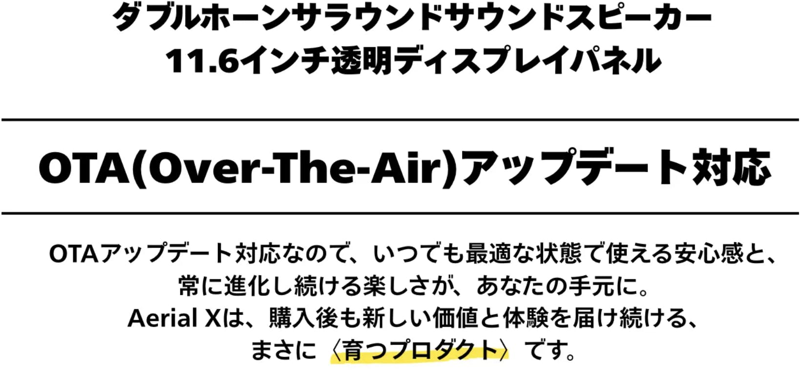 Aerial XはOTA(Over-the-Air)アップデートに対応しており、常に最新の機能や改善点にアクセスできます。このシームレスなアップデート機能により、手動でインストールすることなく、デバイスを最適な状態に保つことができます。OTA対応により、Aerial Xはユーザーと共に進化し、新しい機能強化をデバイスに直接お届けします。