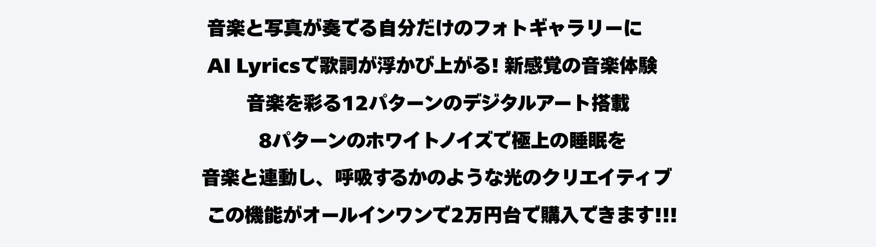 歌詞生成機能は、再生中の音楽をもとにAIが歌詞を生成する機能です。公式歌詞データを取得・表示するリリックスピーカーとは仕様が異なります。現在は主に英語楽曲での使用を推奨しています。日本語の歌詞生成も対応していますが、今後のアップデートの精度向上の予定です。またフォトフレームモードでは、歌詞表示はフレーム下部の固定表示となります。