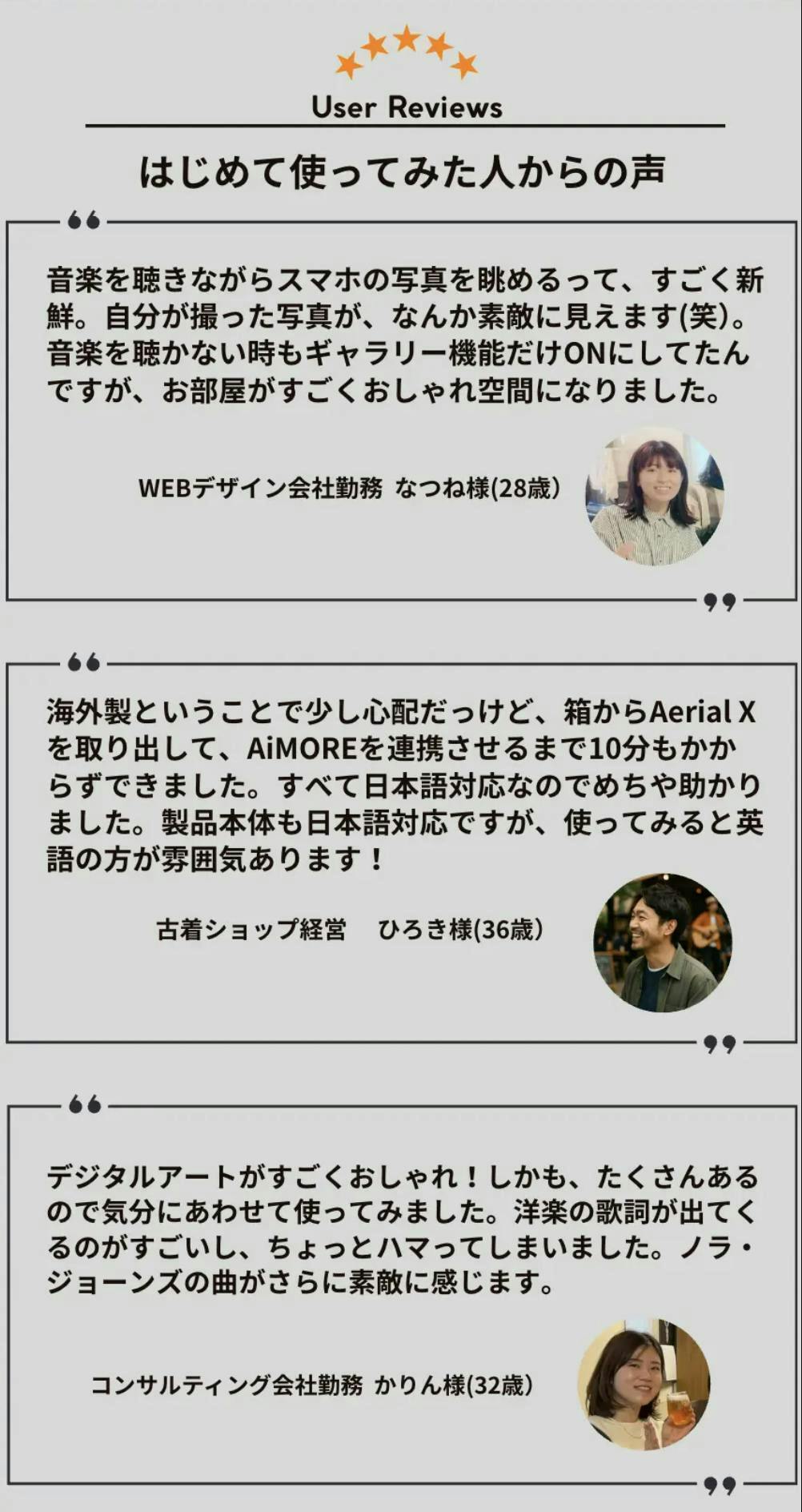 「歌詞が音楽と一緒に浮かび上がる体験って、どれだけ心を動かすだろう」「聴く」から「感じる」へ——そんな新しい音楽体験の原点として、Aerial Xは誕生しました。そして今、彼らの情熱と技術は、生産チームとともに結実し、あなたの手元へと旅立つ準備を整えています。