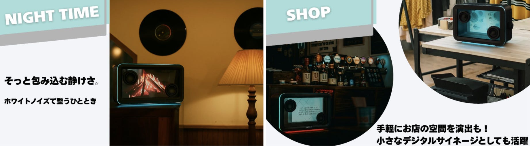 夜のくつろぎタイムは、ホワイトノイズ機能が活躍。自然由来の環境音とムービーで気分を和らげましょう。快適な睡眠にもオススメです。Aerial Xは店舗でも活躍シーンも可能。特別なディスプレイとしての演出や、お手軽なデジタルサイネージ代わりとして、お店のPRやカタログなどの使い方もできます。