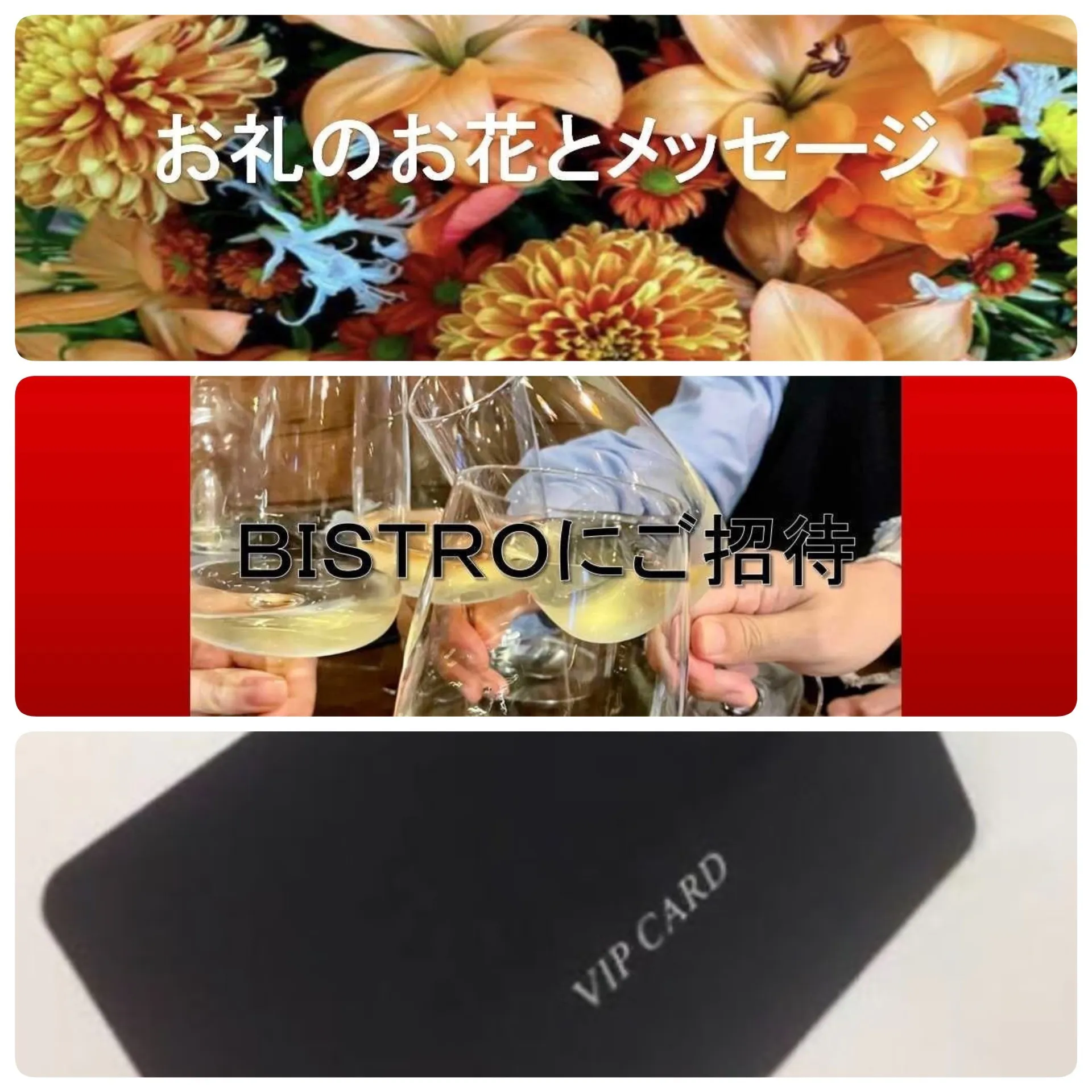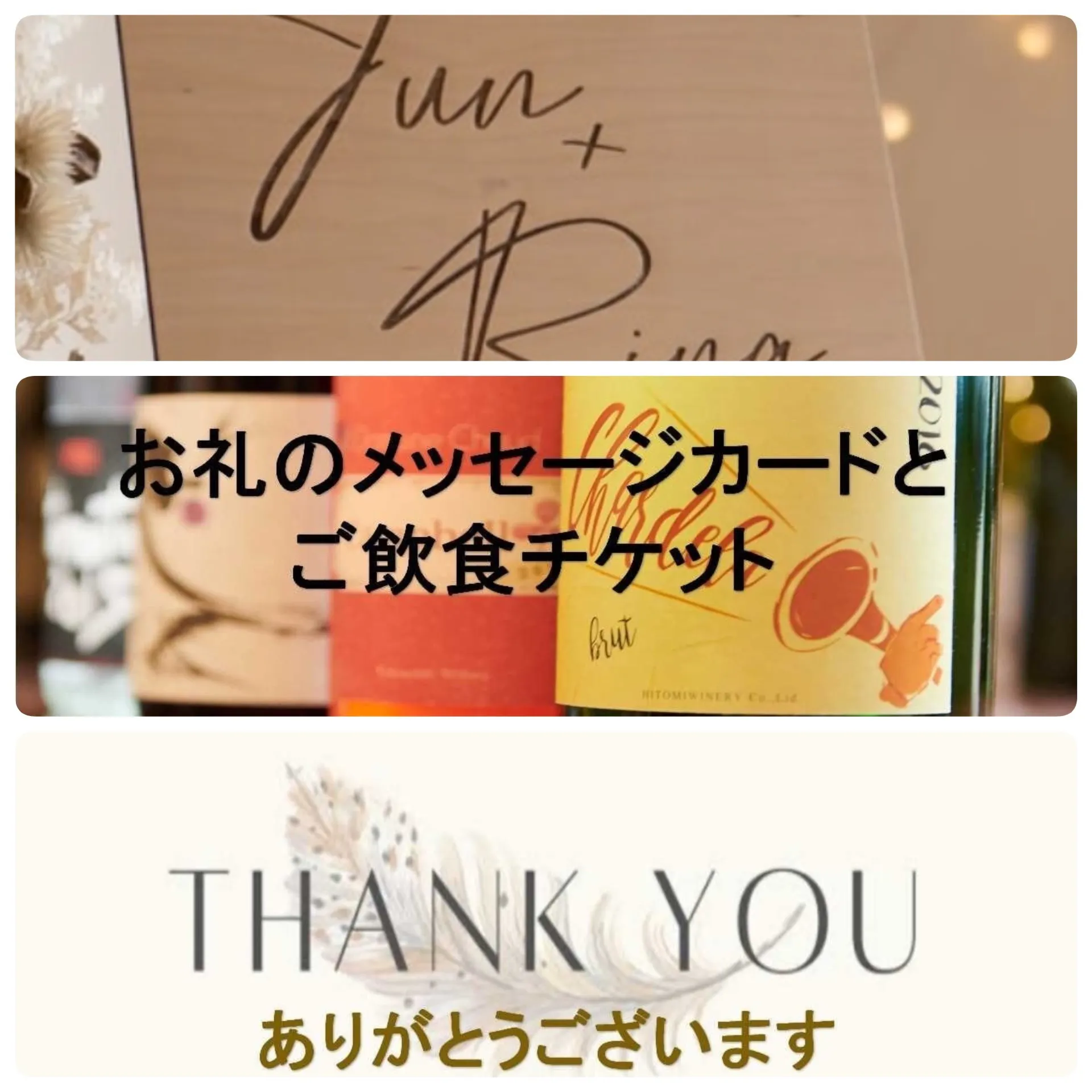 お花とメッセージカードのセットやポストカードにお礼のメッセージを添えた、オープンしたお店にてご利用いただけるお食事券。現在、自分が在籍しているビストロにて、ご飲食する券などご用意しております。