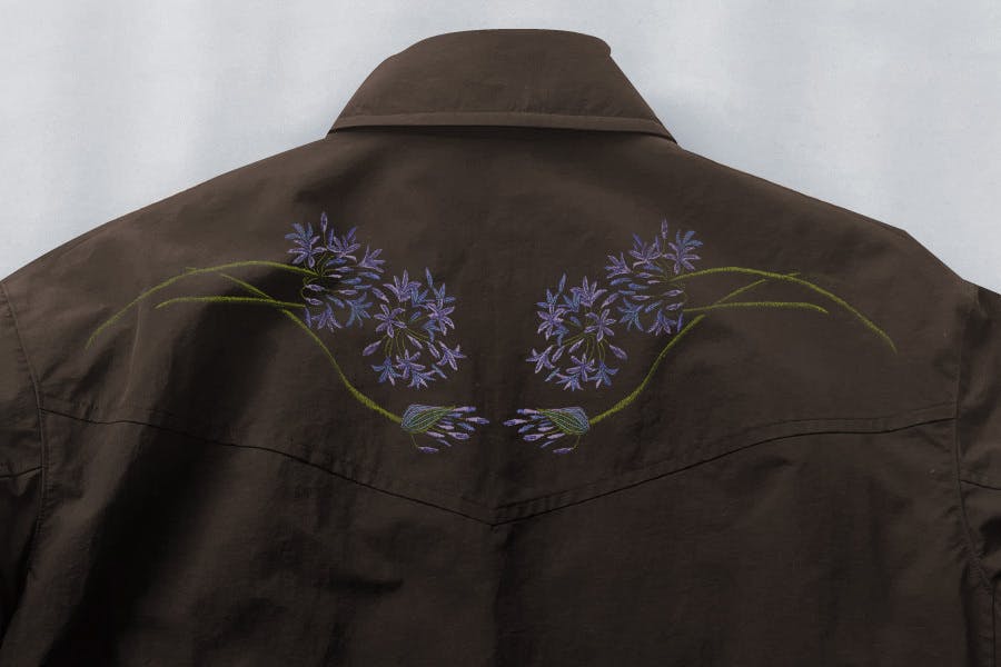 刺繍柄は、デザイナーのコレクションアーカイブから厳選したアガパンサスという花のモチーフです。※参考画像以外の色柄については返礼品の詳細画像を御覧ください