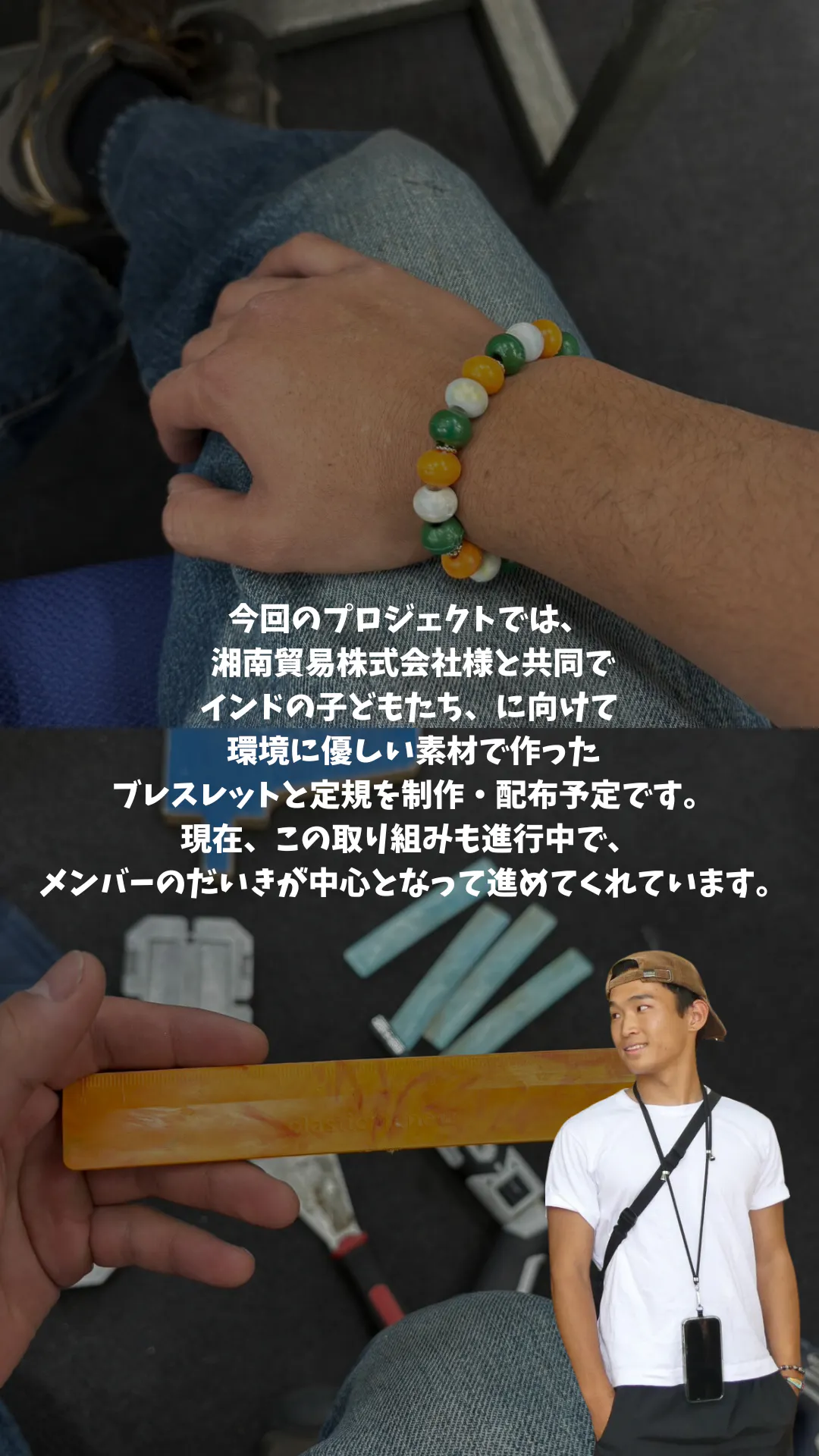 今回の横断旅では、子供達にブレスレット、定規等を配布するため、株式会社湘南貿易様と共同で製作しています。
