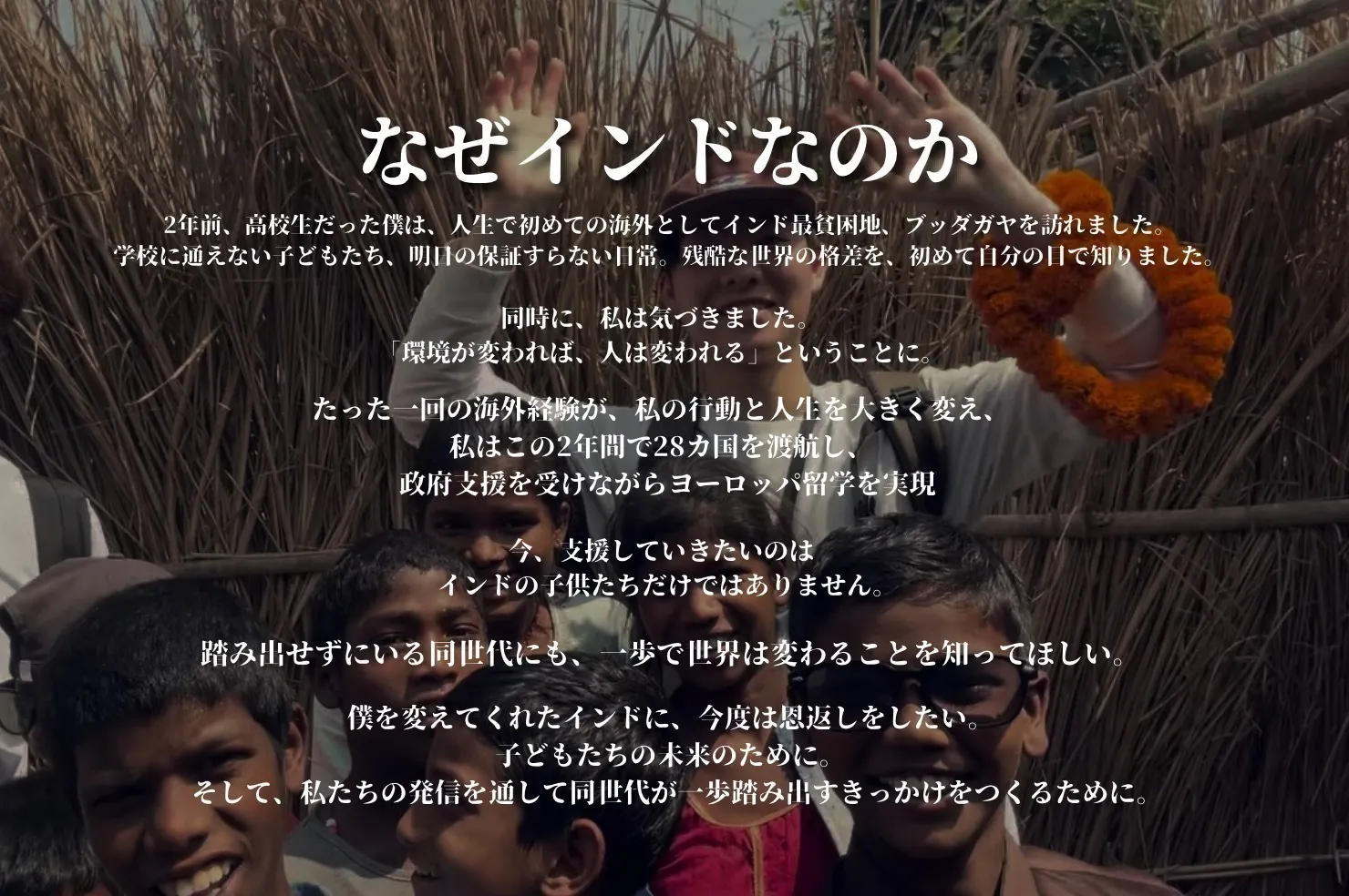 高校卒業後、はじめての海外でインドに渡航し、学校に通えない子どもたち、明日の保証すらない日常。残酷な世界の格差を、初めて自分の目で知りました。