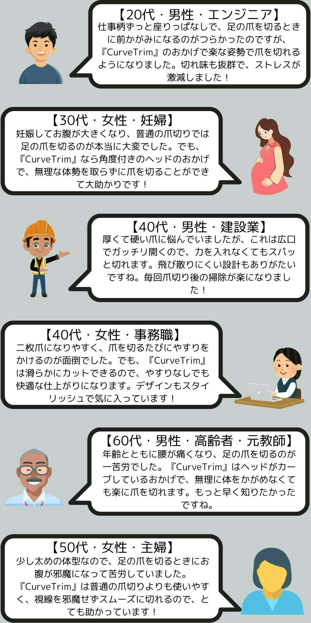 『CurveTrim』を実際に使った方から、「腰を曲げずに爪が切れるのでラク」「硬い爪もスパッと切れて気持ちいい」「爪が飛び散らず後片付けが簡単」といった喜びの声が届いています。