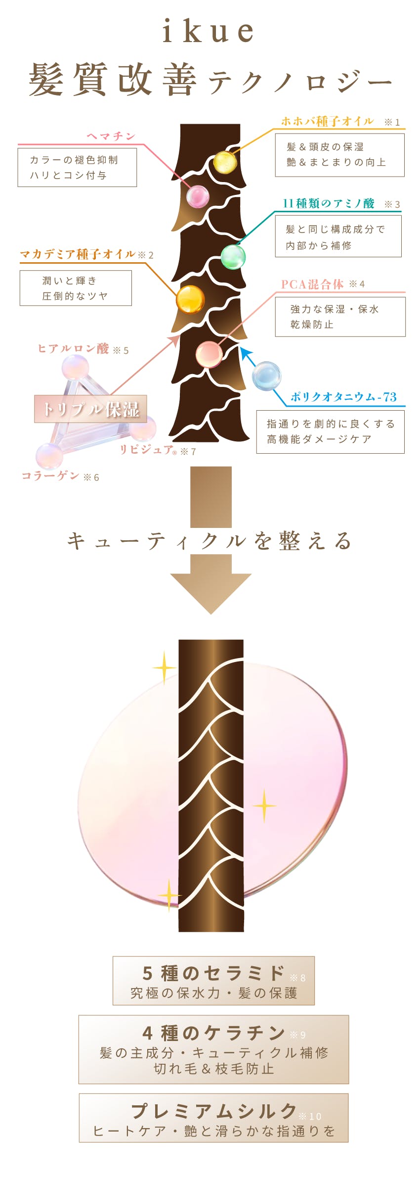 4種のケラチン ※9、3種のセラミド ※24、プレミアムシルク ※10、コラーゲン ※6、高保水成分リピジュア® ※7など。