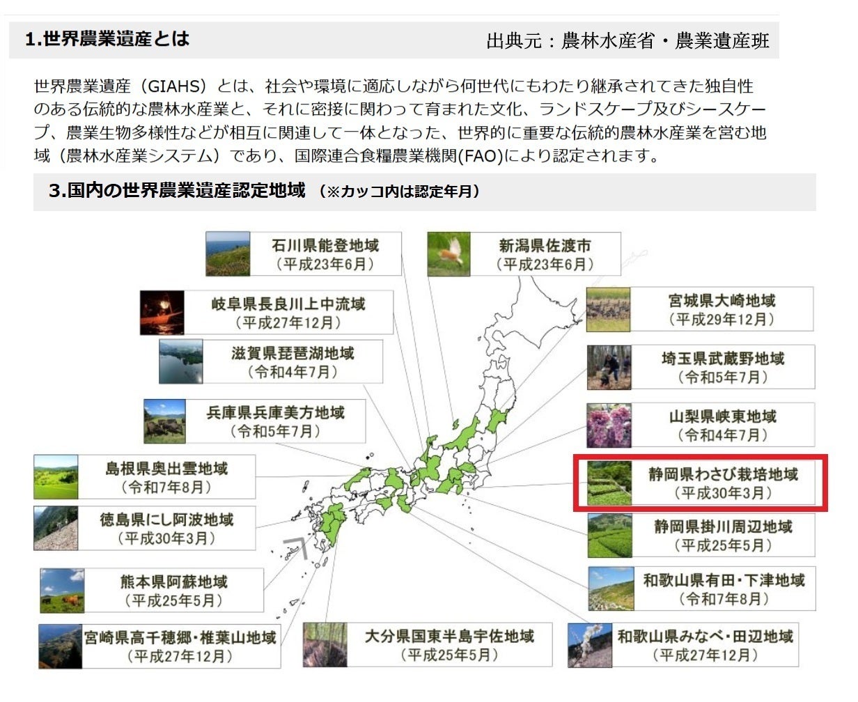 静岡の畳石式水わさび栽培は 2017年3月には日本農業遺産、2018年3月には世界農業遺産に認定されています。
