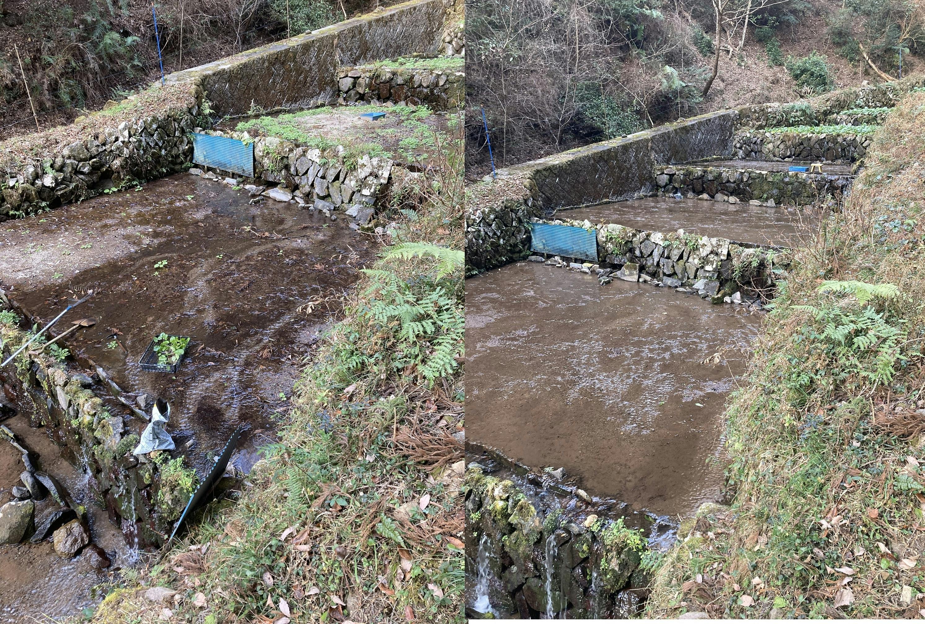 作付予定4段を整備 後、ポンプの水圧で田を攪拌して準備終了