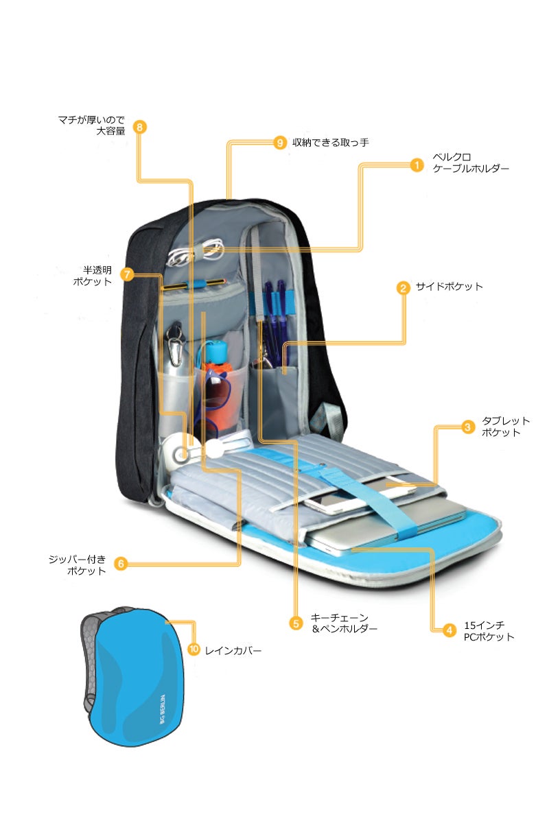 - ③ ポケットが13か所ついていていて、 15インチノートPCとタブレットを同時に収納可能です。