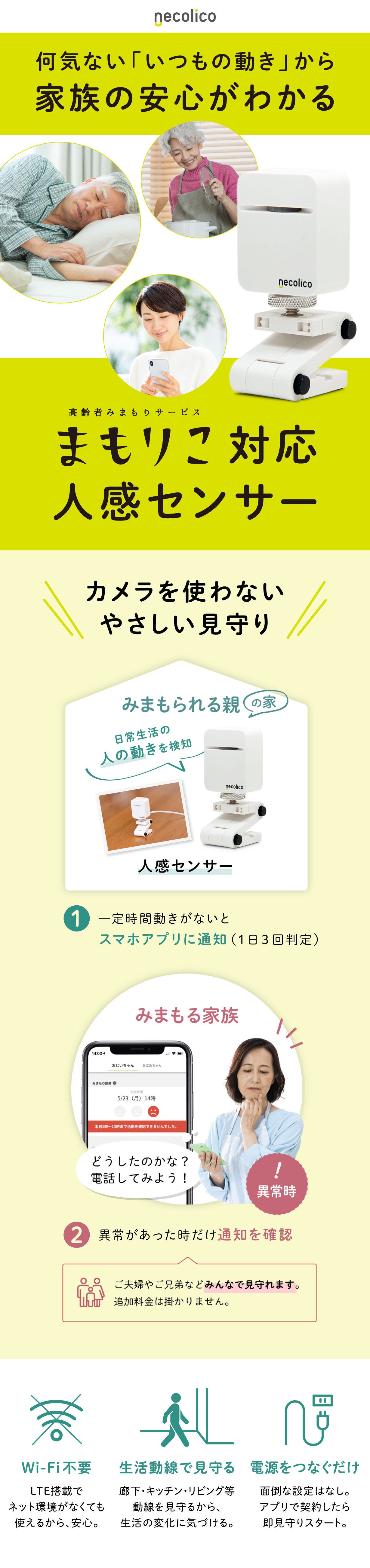 まもりこ人感センサーは、LTE通信を内蔵しているため、実家にWi-Fiがなくても使えます。