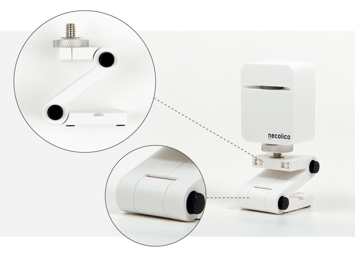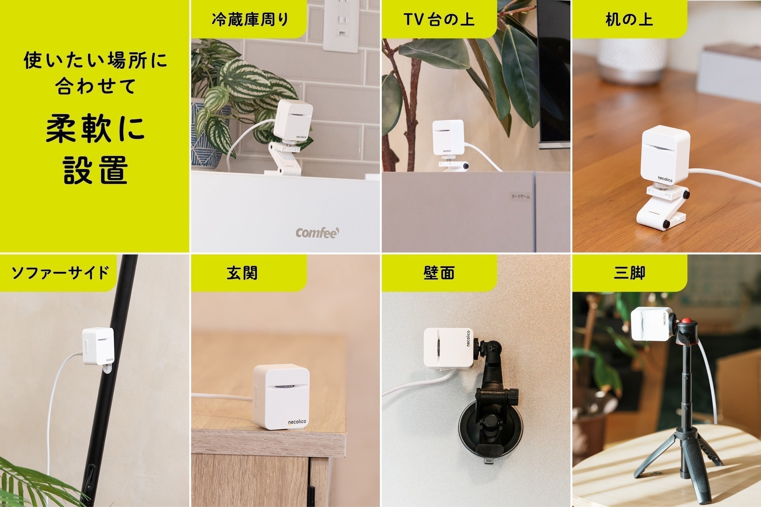 両面テープ、石膏ボード用ピン、木材用ネジの3種類の固定パーツが同梱されているので、壁でも棚でも、リビングでも廊下でも設置可能。さらに1/4インチ三脚穴にも対応しており、市販の小型三脚も使用できます。