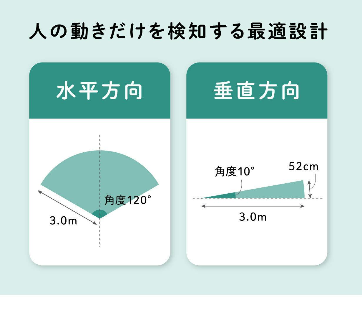 水平方向の検知範囲を広くとり、生活の動線をしっかりと捉えつつ、垂直方向の検知範囲を狭く抑えることで、ペットの動きや家電の熱源による検知を抑制する設計です。