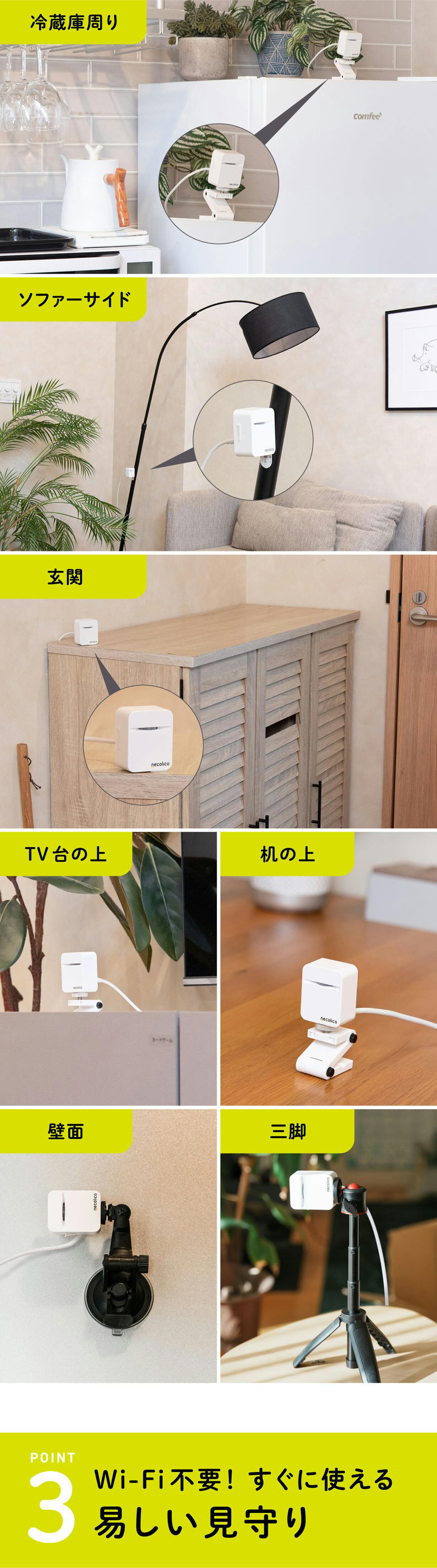 両面テープ、石膏ボード用ピン、木材用ネジの3種類の固定パーツが同梱されているので、壁でも棚でも、リビングでも廊下でも設置可能。さらに1/4インチ三脚穴にも対応しており、市販の小型三脚も使用できます。