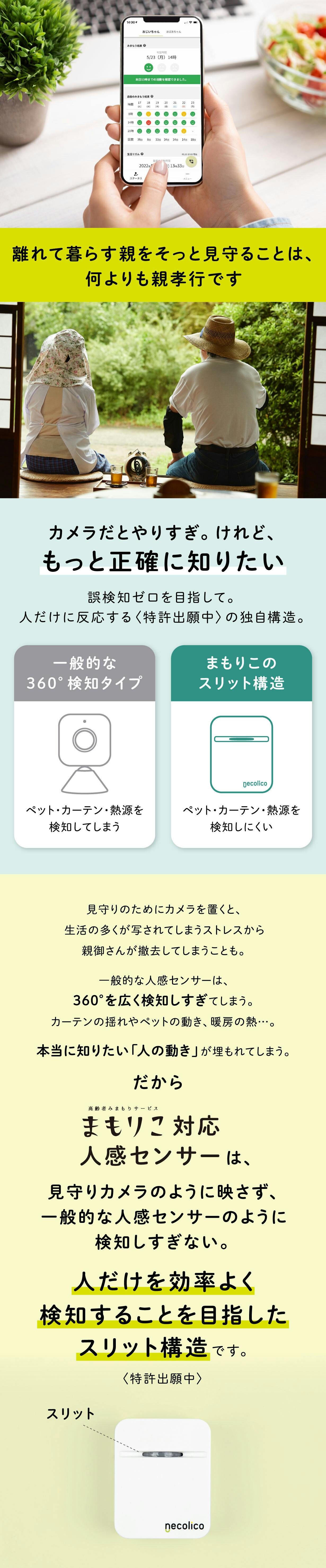 高齢者の見守りサービス“まもりこ”シリーズは、「カメラに映されることに抵抗がある」「Wi-Fi環境がない」という高齢者見守りの現場から届いた声から生まれた、暮らしに本当に寄り添う見守りソリューションです。