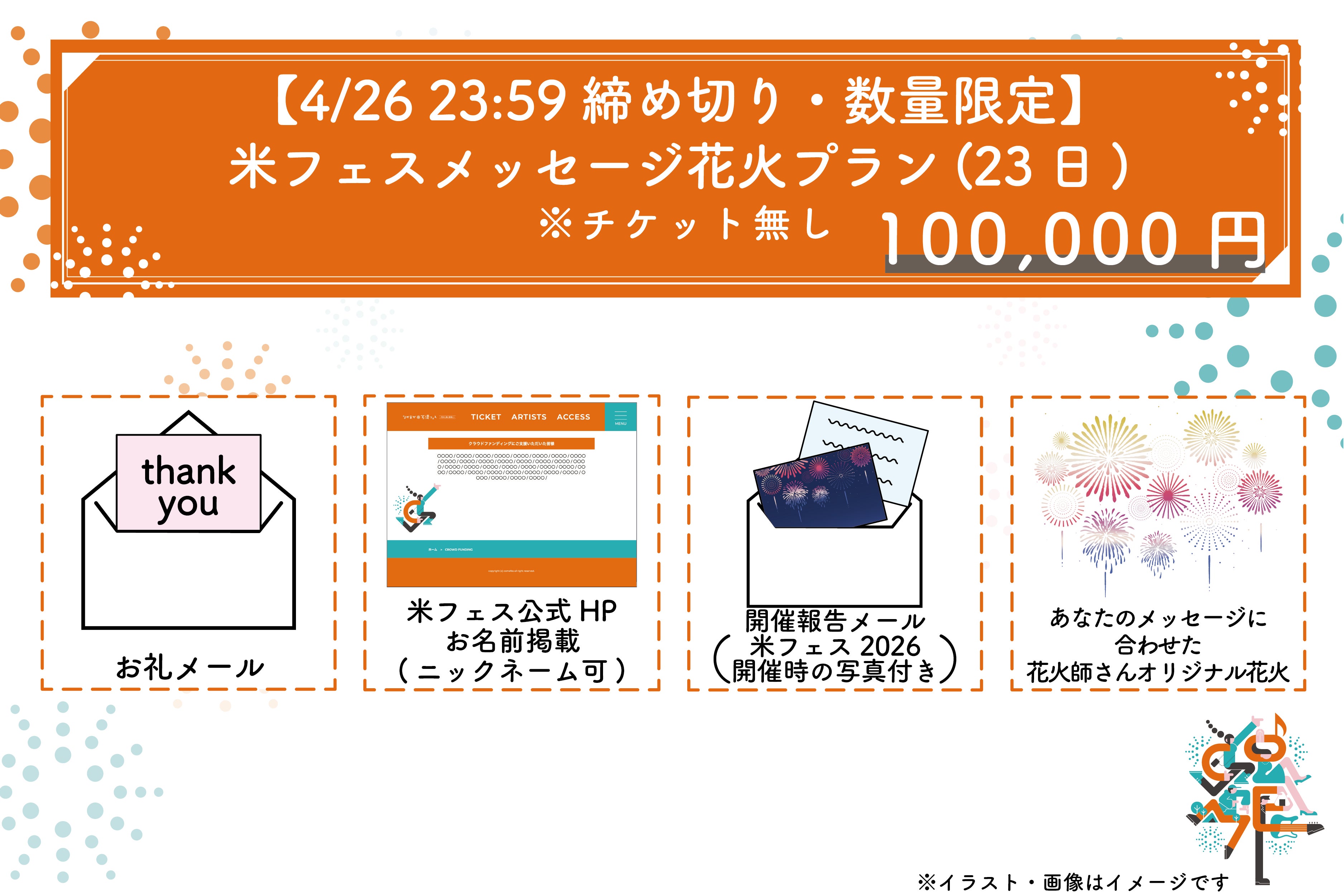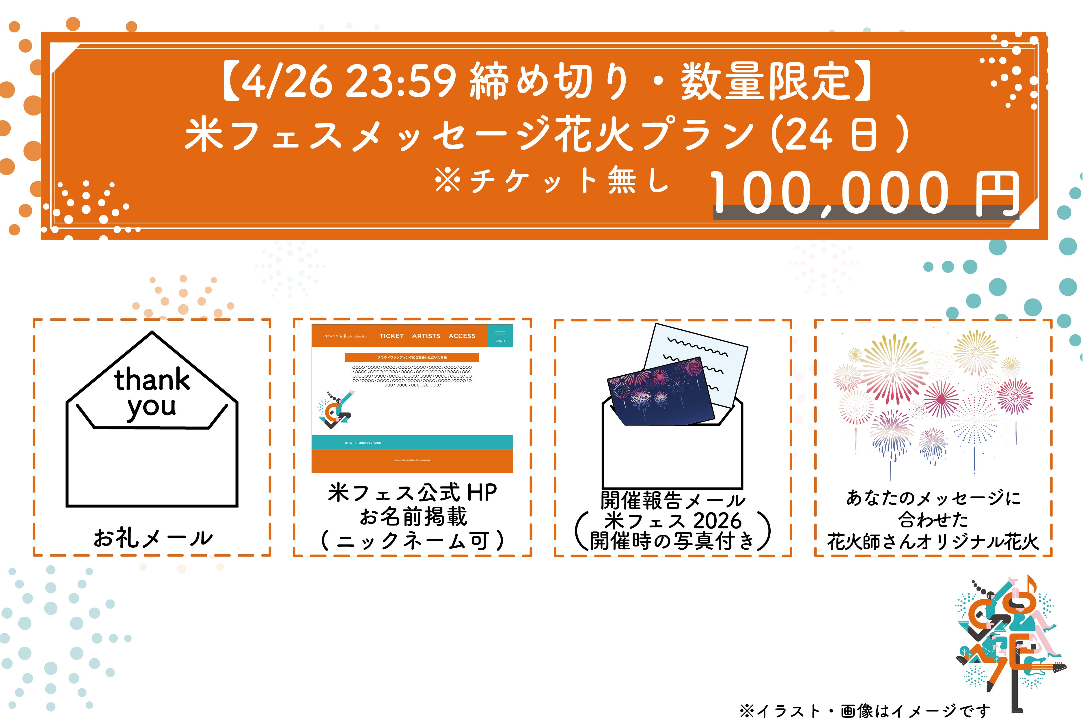 ◆【4/26 23:59 締め切り・数量限定】米フェスメッセージ花火プラン(23日)◆ ※チケット無し