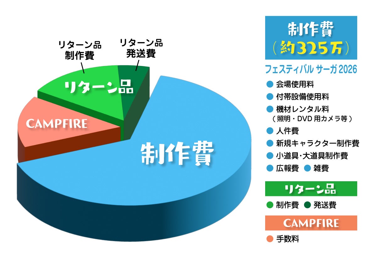 集まった資金についてはおよそ65%をフェスサガ制作費に、残りのおよそ35%はCAMPFIREの利用料やリターン品の制作費や発送費に充てる予定です。