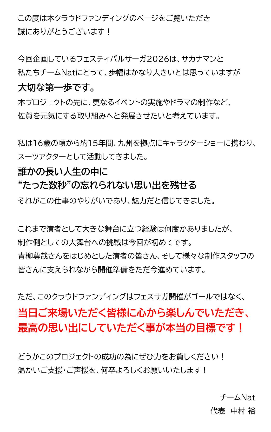 2026/02/20 18:32クラウドファンディングをご支援いただき誠にありがとうございます!!只今4/18(土)のフェスサガに向けて着々と準備を進めております!先日フェスサガ2026のメインビジュアルを公式Xで公開しました!!チケットは本日この後19:00から予約受付開始いたします!チケットサイト→tiget.net/events/464890大人子供一律で入場料500円!しかも入場特典としてキーホルダーまで付いてきます!!会場には800席もあるので、来ていただける方は家族や友達、友達の友達、親戚6親等分ぐらいまでお誘いあわせの上遊びに来ていただければ幸いです!!クラウドファンディングの受付は 3/31(火)までです!引き続きの応援、そしてプロジェクトの応援&ご支援&拡散をよろしくお願いいたします!チームNat一同 もっと見る