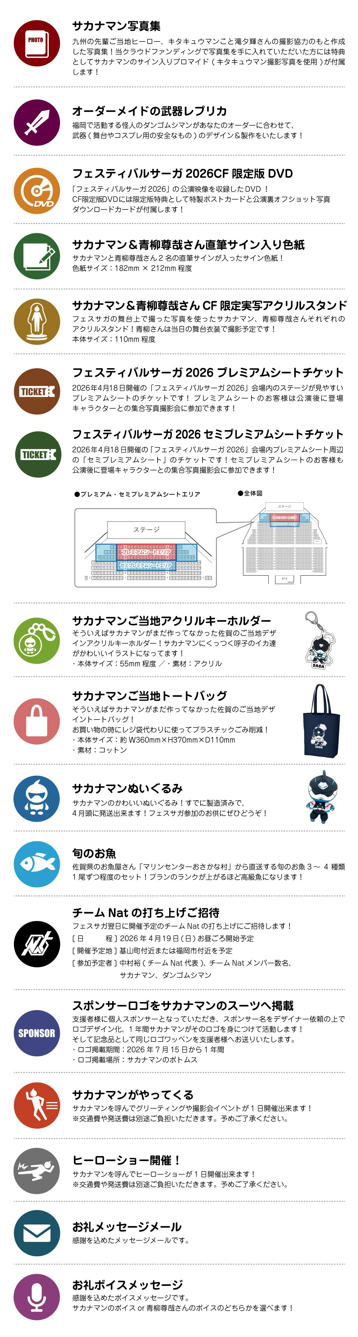 2026/03/17 22:41クラウドファンディングご支援&応援いただき誠にありがとうございます!!サカナマンプロジェクト運営スタッフでございます。活動報告と銘打ってここに何度か投稿しておりますが、成果物イベントであるフェスサガ2026の準備の進捗が分かるような派手な画像も出せておらず申し訳ございません…なぜ出せないのかと言うとめちゃくちゃネタバレになるからです。新しく作っているものが物語の大事な部分過ぎて出したいけど迂闊に出せない…出来ればフェスサガ会場で皆さんに100%驚いたり喜んだりして欲しい!!そんな思いでただ今着々と準備を進めております。とにかくいつもならご一緒出来ないようなものすごい方々と、ものすごい数の連絡を取り合って、ものすごい頑張ってます!!という事ぐらいしか現段階でお伝え出来ない状態です。あと強いて言えば台本が一昨日完成したそうです。脚本担当と代表でかなりの時間の打ち合わせ、修正、紆余曲折を経たと聞いております。初めて見る方も楽しめるような、それでいてサカナマンの世界が更に広がるような台本です!ぜひ楽しみにしていてください!!そしてアレですね…クラファン終了まであと2週間です!!おかしい…時間が経つのが早すぎる…!ただ今の支援金額計はおかげさまで330万を超え、第二目標の350万目前となっていますが、このクラウドファンディングは500万円の最終目標を達成して制作費とトントンですのでメンバー全員ハラハラドキドキしながらクラファン宣伝&フェスサガ準備を頑張っております!ぜひフェスサガ開催までプロジェクトの応援&ご支援をいただければ嬉しいです!引き続き何卒よろしくお願い申し上げます!!!! もっと見る
