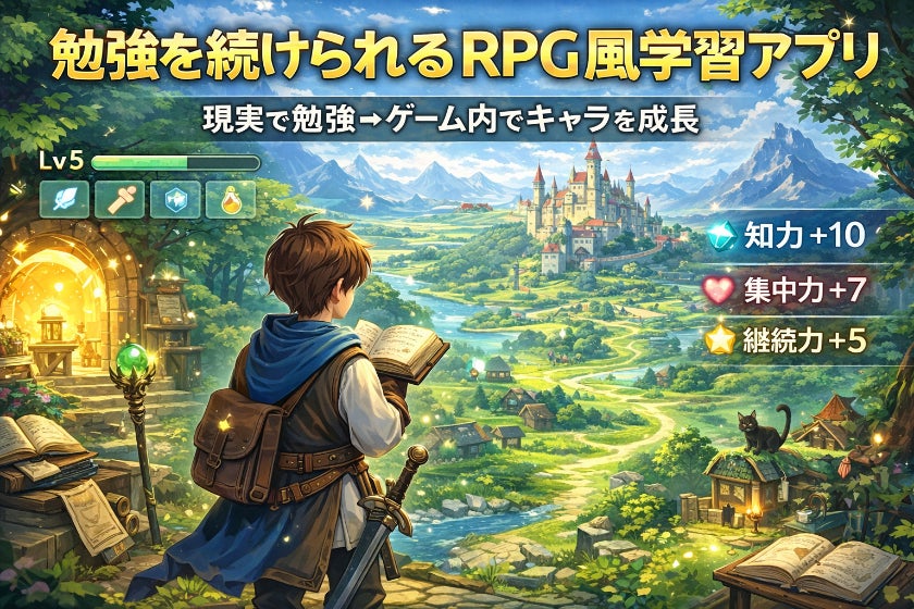 ・30分勉強すると経験値が増える・学習クイズに答えるとスキルが身につく・継続することで物語が進む