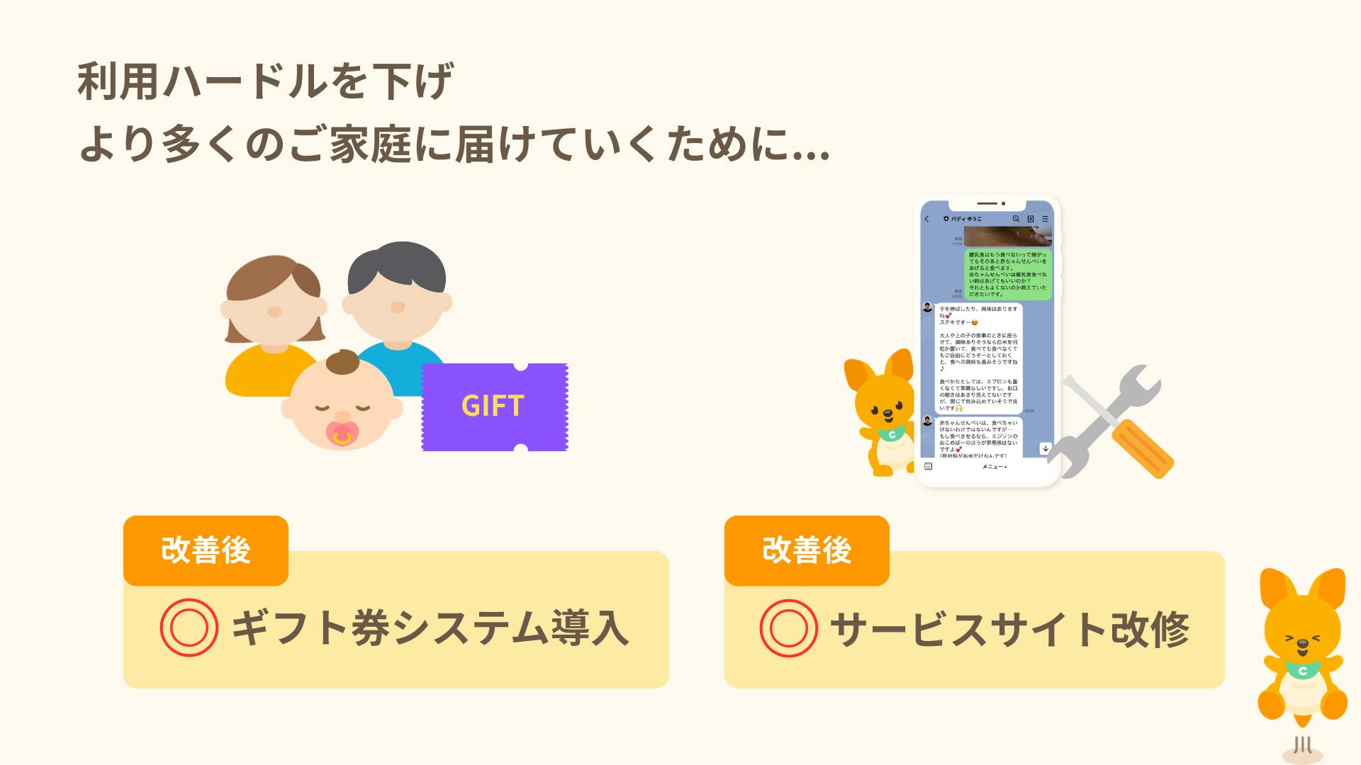 これまで、広告宣伝を打つことなく、累計1,000名のママとパパにご利用いただきました。しかし、1ヶ月目から550円をお支払いして、相談をすることはまだまだハードルが高い現状があります。多くのご家庭に気軽に頼っていただけるよう『ギフト券システムの導入』と『サービスサイトの改修』を行い、チルディッシュの利用ハードルを下げていきます。