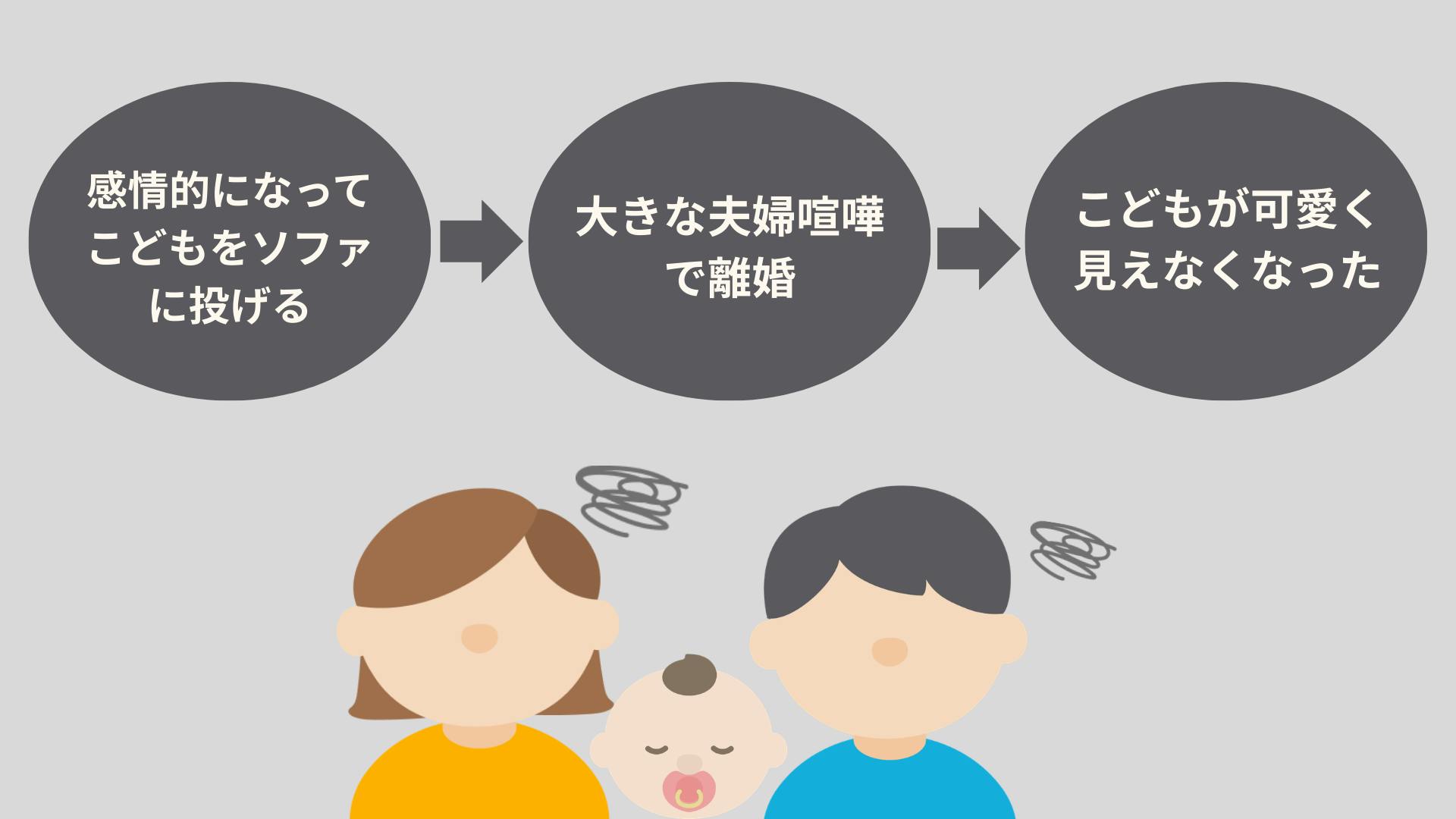 その結果、→感情的になってこどもをソファに投げる→大きな夫婦喧嘩で離婚→こどもが可愛く見えなくなったという状態にも発展しているケースもありました。