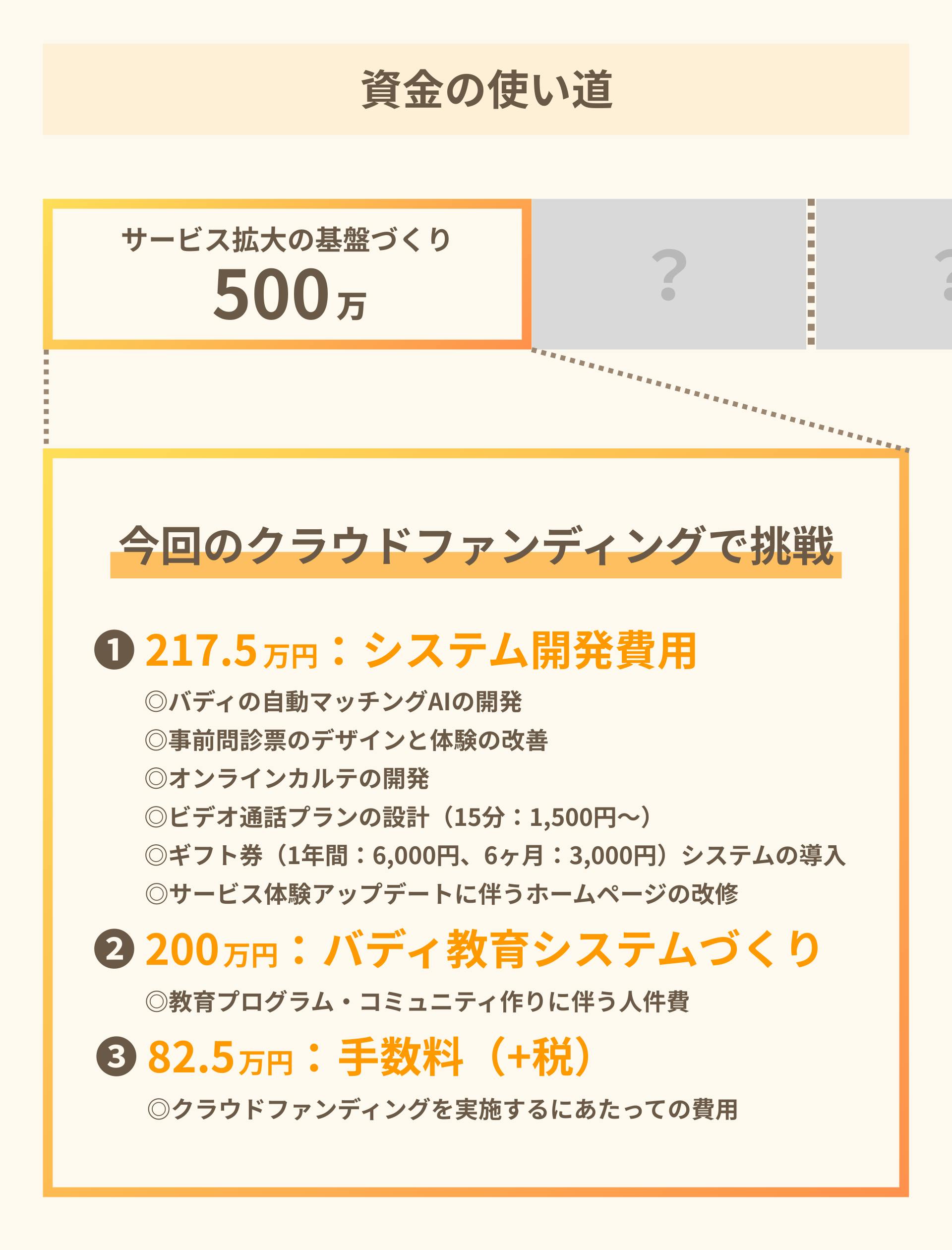 そこで、今回のクラウドファンディングで集めた資金で、全国1,000万以上の子育て家庭に「安心して頼れる先」を届けるための力強い基盤を作っていきたいと思っています。