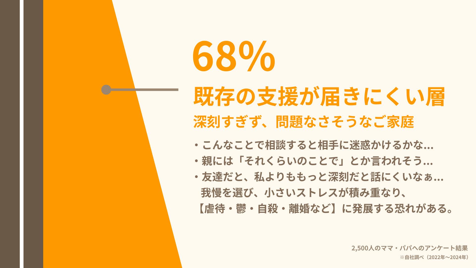 そこで話を聞いた2,500人のうち、約7割のママ・パパが支援自体は知っているが、『もっと頑張らないといけない』『この悩みで窓口に相談いく方が迷惑かも』『電話予約するのも時間決まってるし、言葉にするのもハードルが高い』そのような理由で我慢をすることを選んでいました。