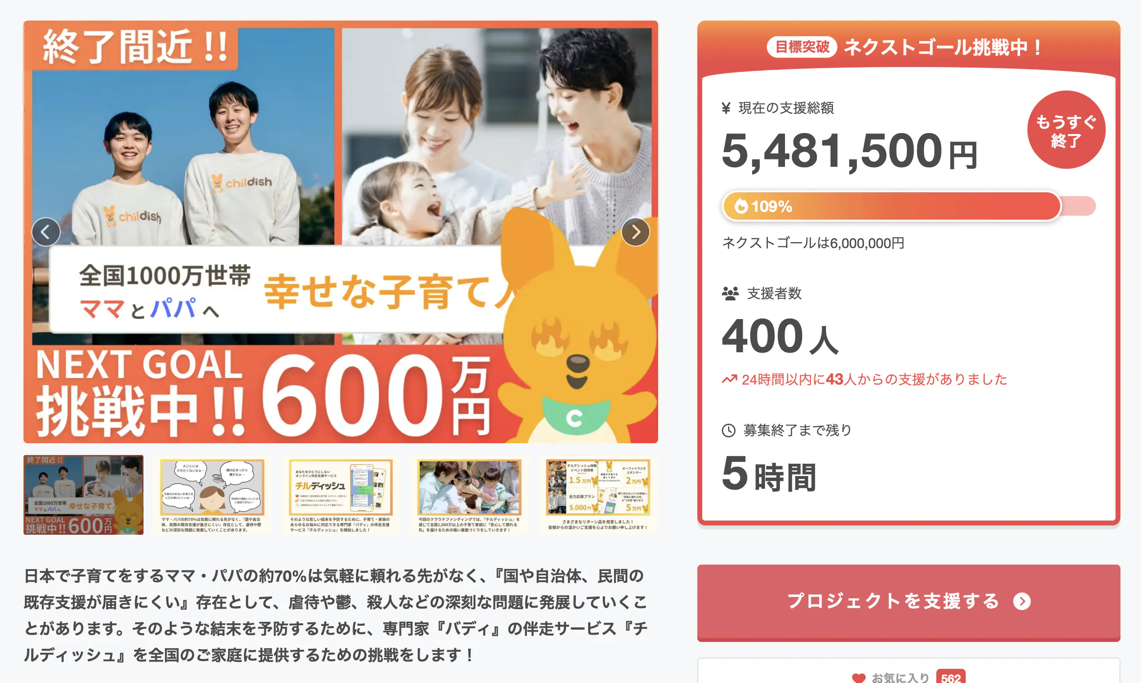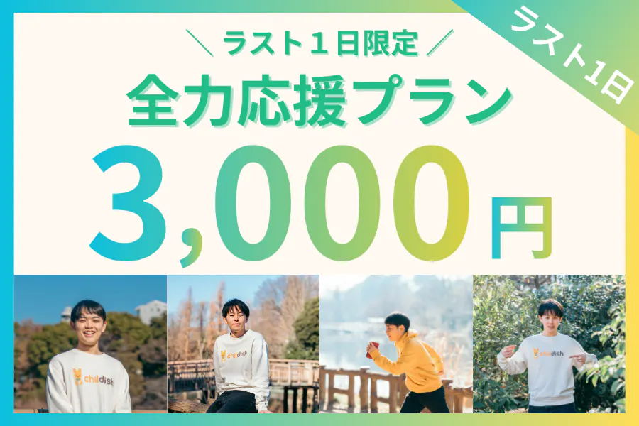 OhMyFamilyの加治木です。ついに、終了まであと5時間を切りました!セカンドゴールの達成までなんとあと50万円少し...!ファーストゴール達成後も、あたたかいご支援が増えていて、『400人』にまで到達しました。終了まであと『5時間』僕らの挑戦も、ついに終わりが見えてきました。最後の最後まで、皆さんと一緒に最後まで全力で楽しみ尽くせたらと思っています。ラストスパート、良ければSNSでのシェア・ご支援などで一緒に盛り上げていただけると嬉しいです!!それではまた少し後に!