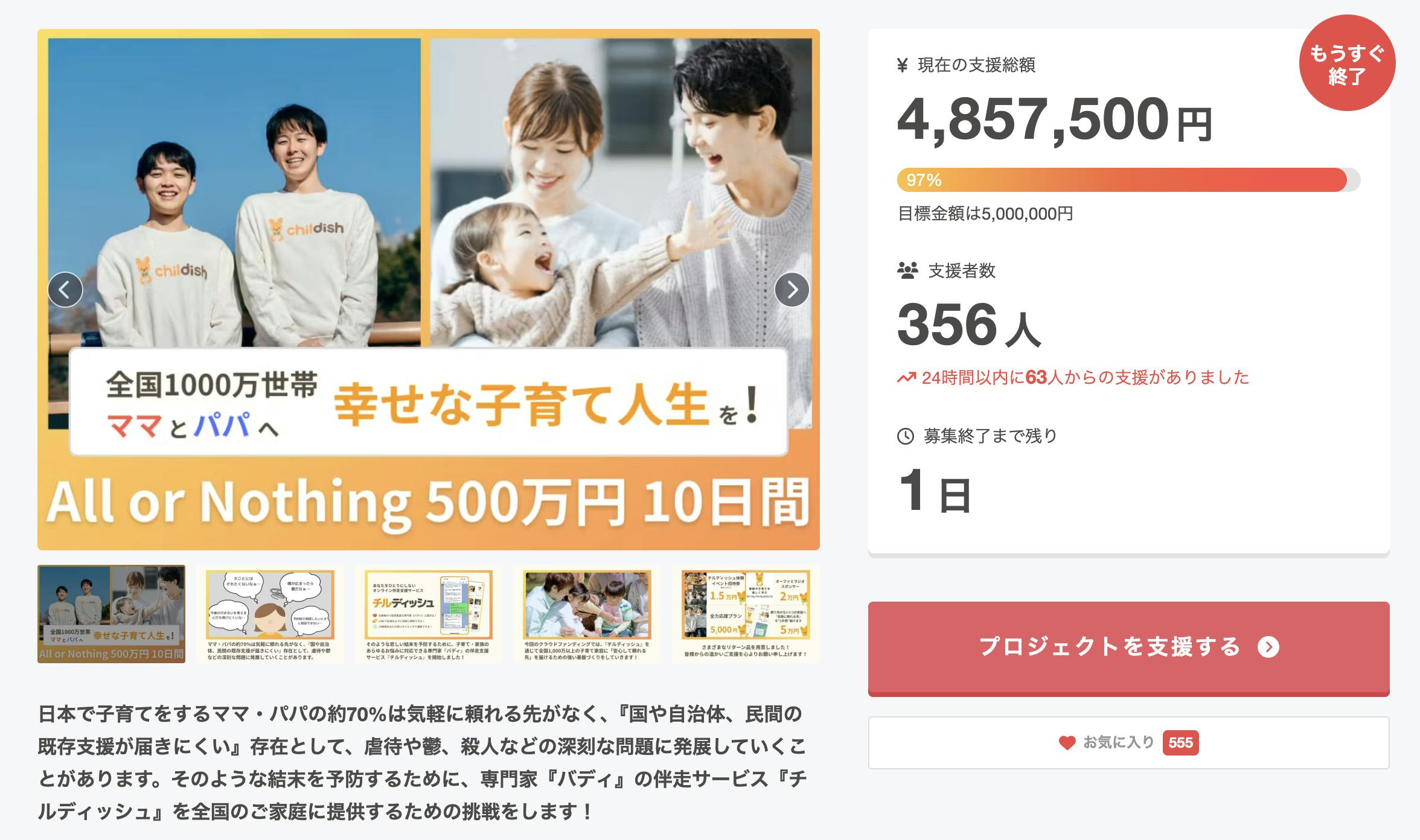 今回のクラウドファンディングでは、『チルディッシュ』を通じて、全国1,000万以上の子育て家庭に「安心して頼れる先」を届けるための強い基盤づくりをしていきたいと考えています!