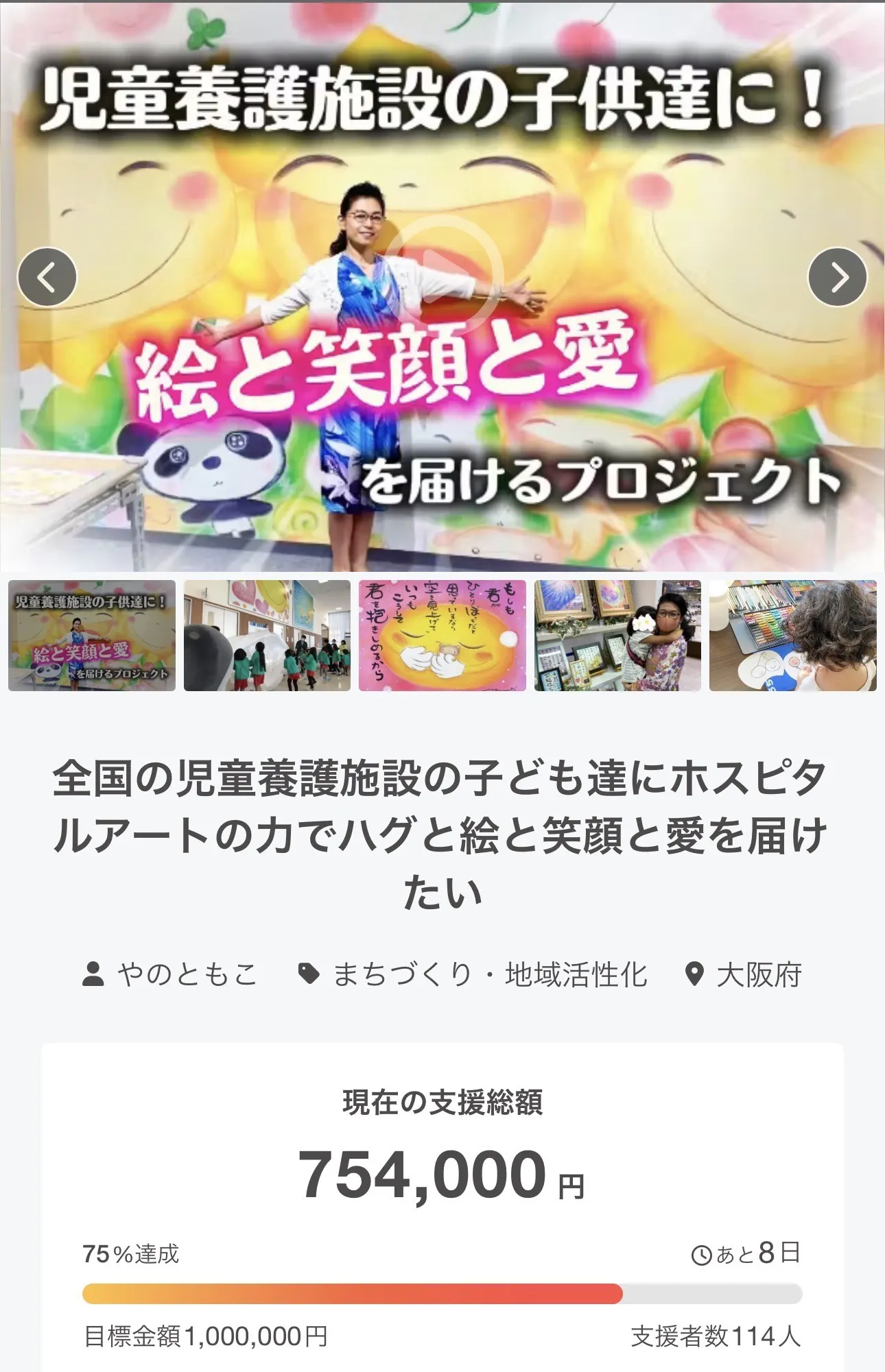 2026/03/29 11:21新たなチャレンジ!【NEXT CHALLENGE130%】おかげさまで只今117%達成!185人の方にご支援いただいております。ありがとうございます!!!残り2日となりました。より沢山の子ども達に会えるように残り2日新たなチャレンジに挑戦します。今回のプロジェクトを知り応援して下った皆さまに、よりこの先の未来も喜んでいただけるように沢山の子ども達に会いに行きたいと思っています。プロジェクトが終われば子ども達にワークショップをしてハグそして絵や絵本を届けます。その様子を今後も発信していくのですが、きっと皆さまに『あぁ支援して良かったな』と思っていただける内容になると思います。一回ではなく継続して色んな施設を回って行きます。その度に皆さまにもほっこりした気持ちになっていただけると思います。だからこそ、その喜びを沢山の方と共有したい。後2日どこまで出来るかわかりませんが一緒に応援していただけると幸いです。よろしくお願い致します。 もっと見る