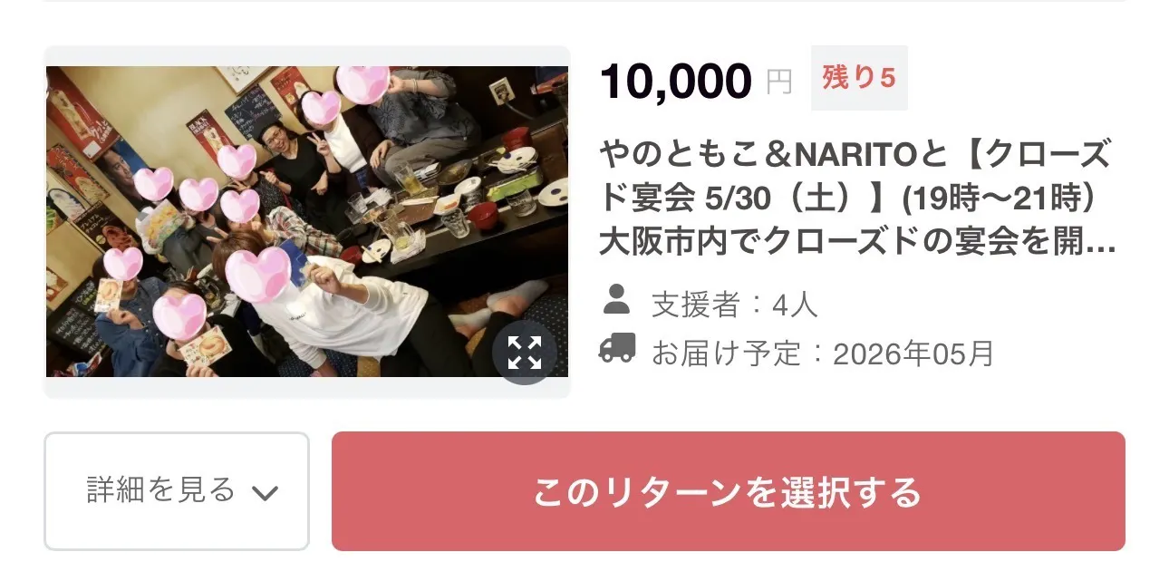 2026/03/26 08:59只今89%!!!支援者131人!!!ありがとうございます!!!そしてクローズド宴会5月30日こちらの宴会は食べ飲み放題!なのですがここにゲスト級の方もいらっしゃることになりました!きゃー!嬉しい!講演会もされる方で関西人なら知らぬ人はいない会社の社長さんです。これはかなりお得なプランになりましたよ!私も今から楽しみにしています。残り5名様です。お早めにどうぞ。美味しいものをご用意しますね!残り5日となりました。先ずはクラウドファンディングを成功させてここからもっともっと色々広げていけるように頑張ります。一緒に子どもの笑顔そしてそれを見た大人の笑顔も広げて行くお手伝いよろしくお願い致します。 もっと見る