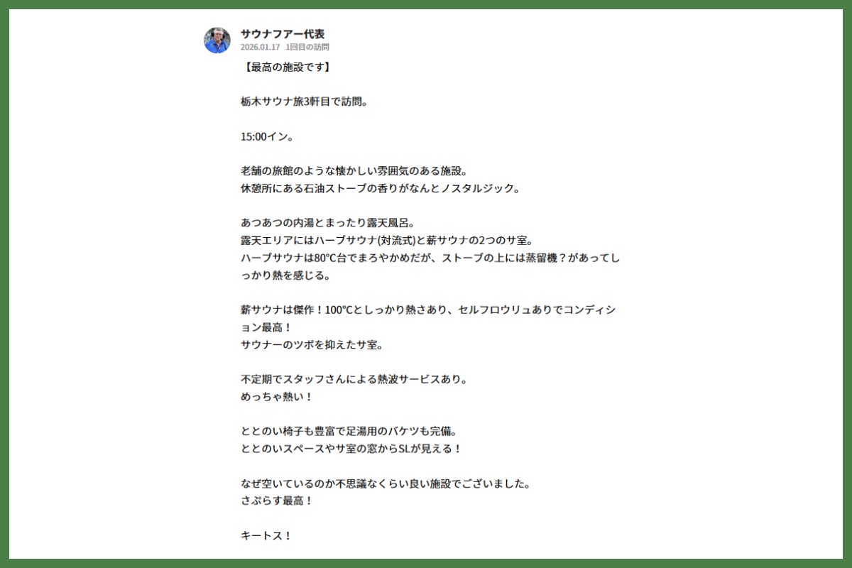 日本最大級のサウナ検索サイト「サウナイキタイ」でも多くのお客様からのお喜びのお声をいただいております。