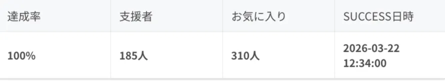 2026/03/23 20:163月22日 12:34分。約2日間。縁起の良さそうな時間に、目標を達成する事ができました。本当にありがとうございました!心より御礼申し上げます!ある支援者さんのメッセージに、次のような一文がありました。「1人の100歩より、100人の1歩の方が遠くまで行ける」…確かに。だからネクストゴールは、金額ではなく、支援・応援してくれる人の数で設定しました。目標は、支援数1,000人。藤原まつりの『輪』を広げることを目指します。伝説のヒーロー・源義経公が、現代のスター・髙塚大夢さんによって蘇る、この、およらく一生に一度の瞬間を、もっともっと沢山の人に知ってもらいたい。ファンタジーな世界が繰り広げられる藤原まつりを、もっと知ってもらいたい。これが今の純粋な願いです。たぶん僕らが出来る最高のこと。しかし、1,000人はちょっと無理っぽい。なので、様々なカタチで藤原まつりを盛り上げくれる「仲間」を募集します。 、もっと髙塚義経公を知って欲しい。 、もっと藤原まつりを知って欲しい。上の空欄に入るのが、「私が」「私は」と思う人は、協力して貰えたら嬉しいです。SNSでつぶやく等、得意なこと、出来ることで良いです。誰かにバトンを渡すように、連鎖するように、小さくても『輪』がつながって、見たこともない大きな『輪』になっていく、そんなイメージを描いでいます。クラウドファンディングの挑戦って、未来の景色を書き換えること。挑戦は、まだ始まったばかりです。 もっと見る