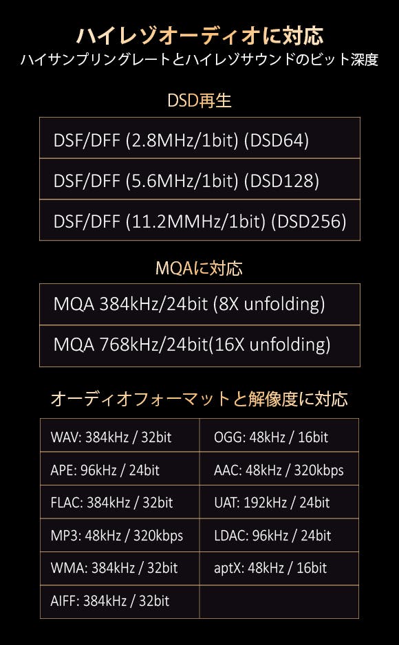 A9:はい。M4AオーディオブックおよびMP3、FLAC、ALAC、WAVとDSD256を含め、様々なオーディオフォーマットに対応します。MQA 16X再生にも対応します。注意:M4BとMP4フォーマットに対応しません。
