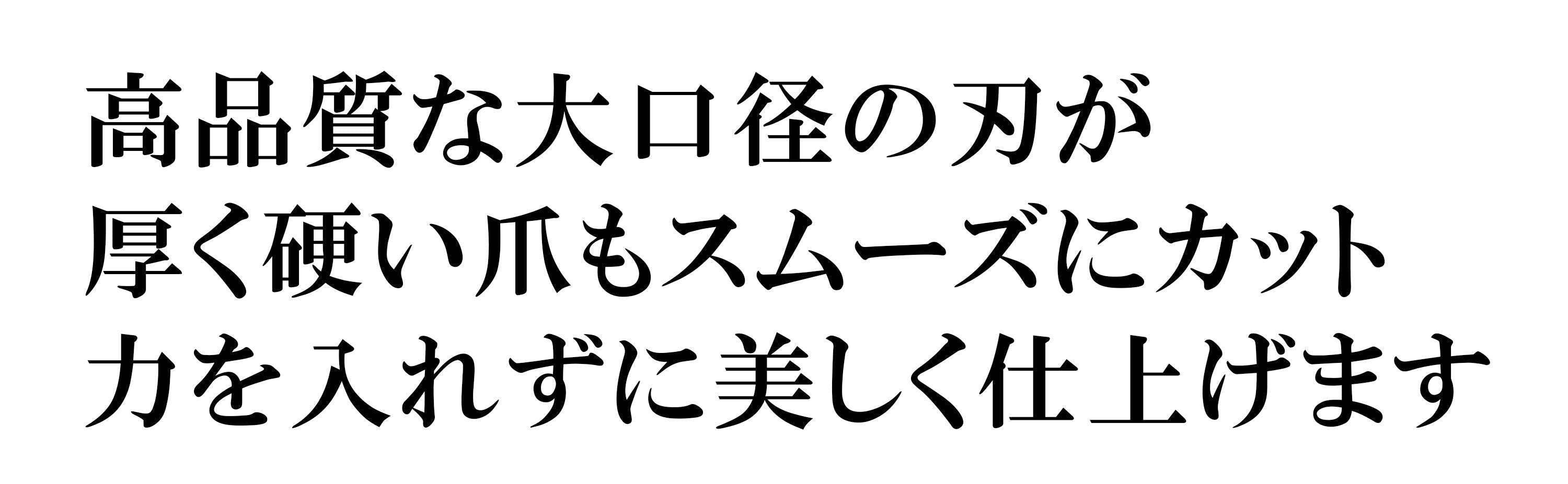 広く開く大口径の刃が、厚く硬い爪もしっかりキャッチし、スムーズにカット。切る際の力を分散し、無理なくスパッと切れるため、爪への負担を軽減し、割れや二枚爪を防ぎます。