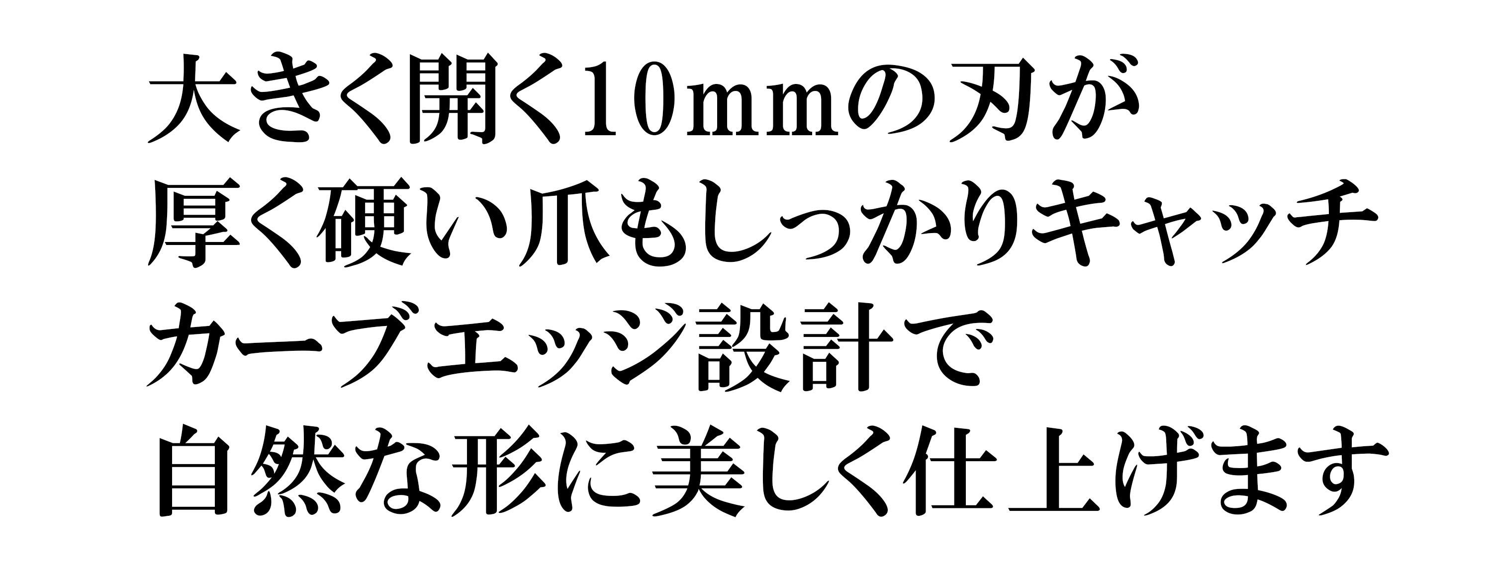さらに、指先の自然なカーブに沿った曲線刃を採用。爪の形を整えやすく、ヤスリがけの手間を減らしながら、美しく滑らかな仕上がりに。理想的なカットを叶える、こだわりの設計です。