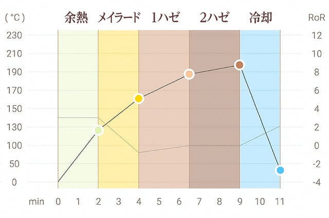 プロがコーヒー豆をローストする際、「①余熱、②メイラード、③1ハゼ、④2ハゼ、⑤冷却」の