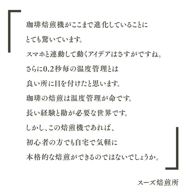 この商品は「焙煎を見て・聞いて・感じる楽しみ」と「スマホ連携で温度と時間を見える化しながら高度な焙煎を行う」を両立しています。