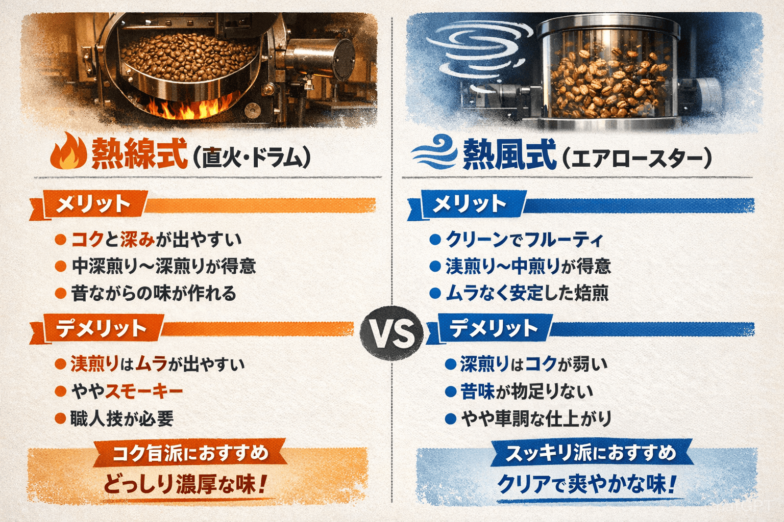 家電製品の焙煎機には「熱線式」と「熱風式」の2種類はあります。
