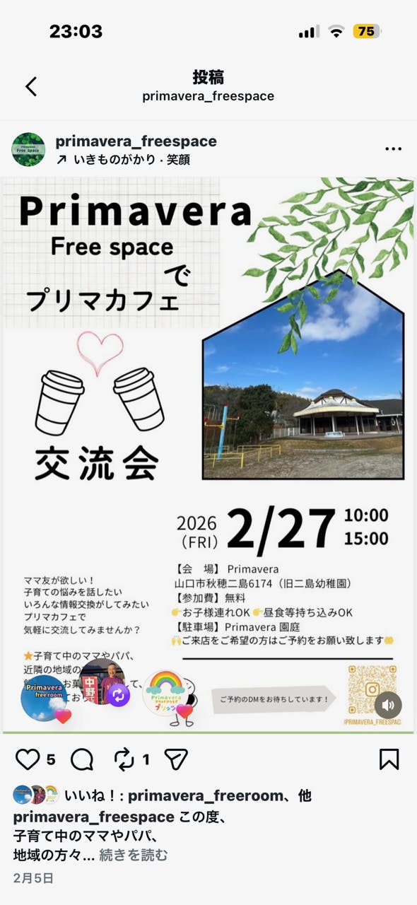 2026/02/20 13:11クラウドファンディングも残り1週間となりました。多くの皆様のご支援に深く感謝いたします。あと1週間、引き続きご支援、拡散をよろしくお願いいたします。 さて、2/27(金)平日ではありますが、Primaveraカフェを開催いたします。日頃の悩みを皆さんで話し合ったり、情報を共有したりしませんか?もちろん、世間話でもOKです。参加者に制限はありません。どなたでもお越しいただけるよう、おいしいお菓子を準備してお待ちしています!! 今はまだイベント開催ですが、いずれ常設カフェスペースとして皆さんの憩いの場としてご利用いただければと思っています。 子供達には同日開催で体験会もご用意しておりますので、親子参加大歓迎です。お子様の体験会のみご予約をお願いいたします。お申し込みはインスタDMか公式ラインにて承ります。 もっと見る体験会・交流会実施しました!!
