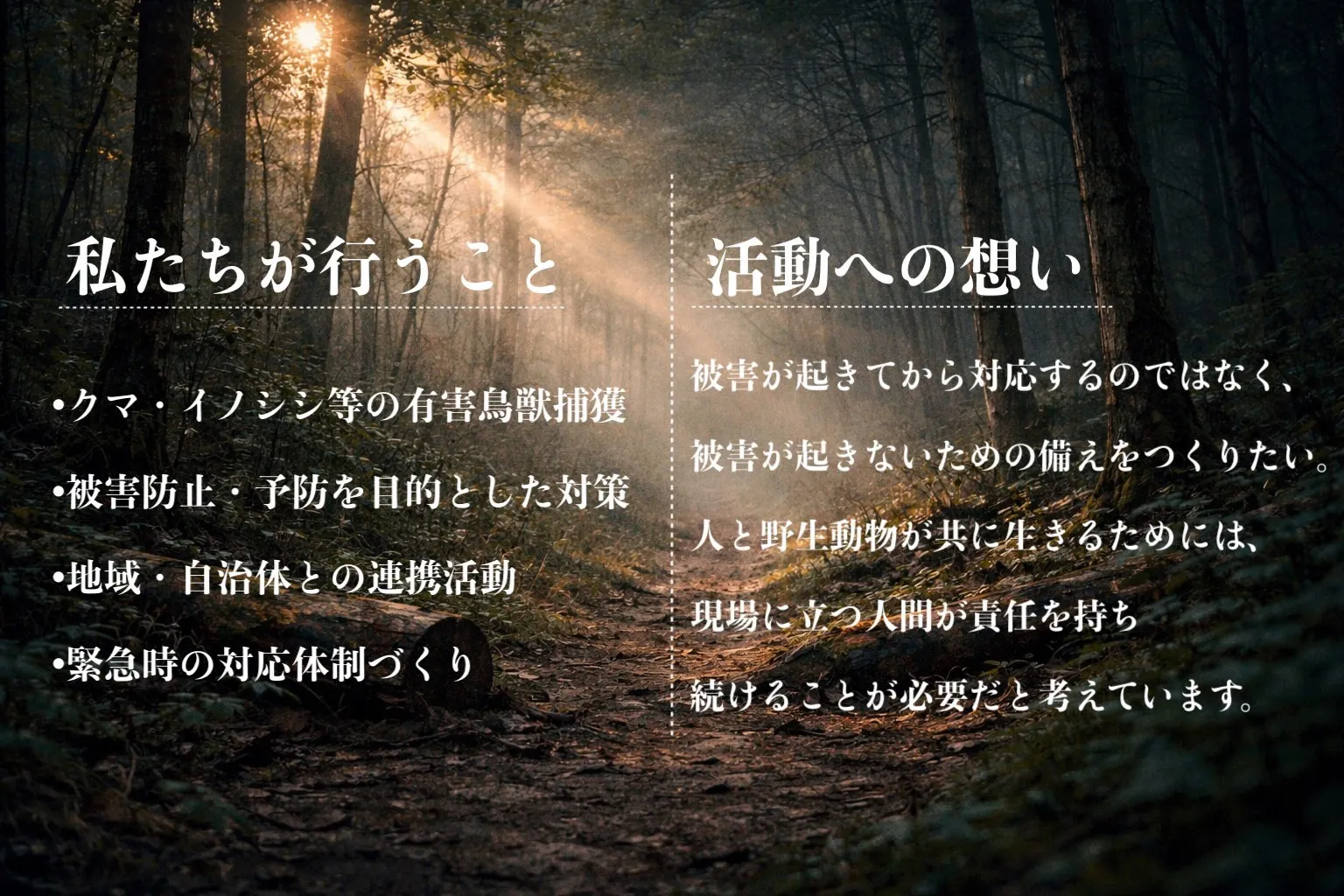 私自身、害獣対策の現場に関わる中で、被害を受けた地域の不安や、対応に追われる現場の負担を、何度も目の当たりにしてきました。
