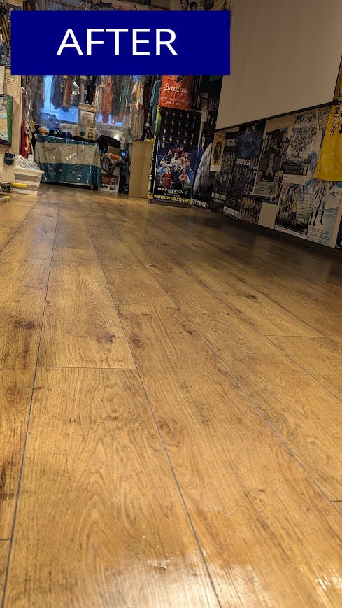 普段の清掃ではなかなか取れなかった長年の床の汚れが見違えるほどにピカピカになり、さらにワックスまで塗っていただいたことで2017年の高円寺移転初年度を彷彿とさせるような店内となりました。