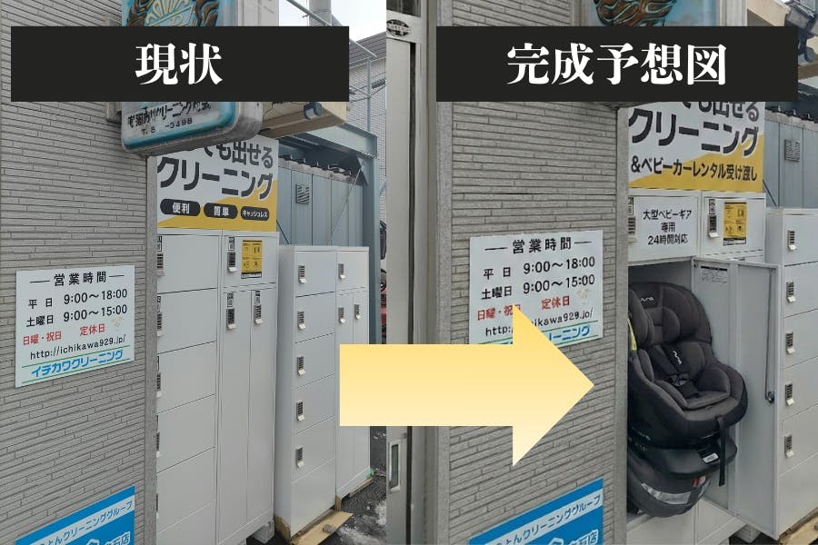 そこで、今回の資金で既存の衣類用ロッカーを、ベビーカーやチャイルドシートが丸ごと入る特大サイズへ改装・整備します。