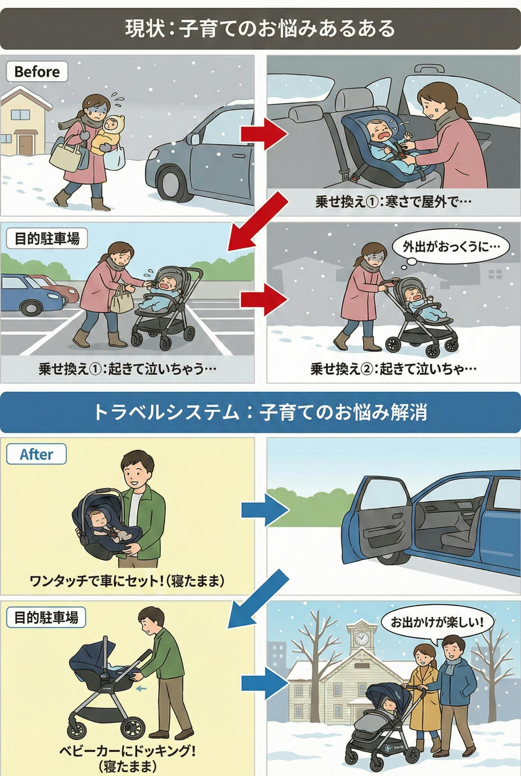 「背中スイッチ」や「冬の過酷な移動」など、親を追い詰める物理的・精神的な負担を、便利な道具(トラベルシステム)の普及によって解消します。