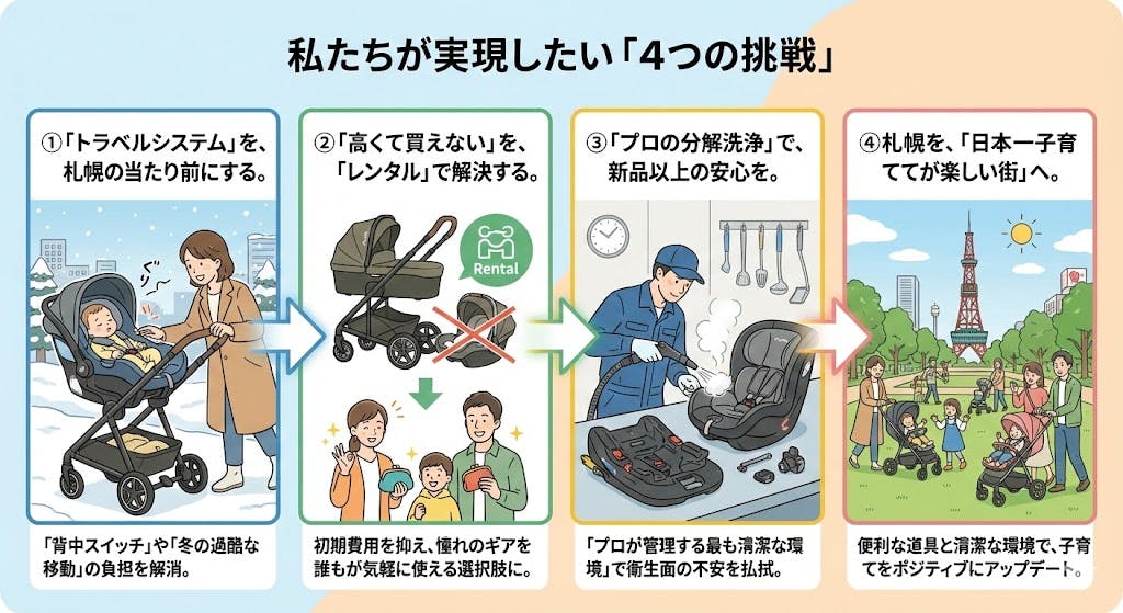 観光客の方にレンタルを利用していただくことで収益が安定し、それが結果として、地元・札幌のパパ・ママへの「子育て支援価格」の維持にも繋がります。