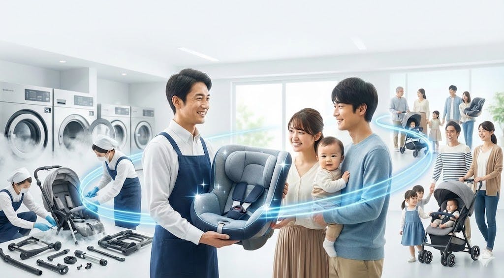 これからの時代に必要なサステナビリティです。しかし、衛生管理が伴わないレンタルは長続きしません。どれだけ高価なベビーカーやチャイルドシートも、メンテナンスしなければ劣化します。 汚れたら洗って、綺麗にして、次の家族へ渡す。壊れそうなら修理する。この「メンテナンスのハブ(拠点)」になれるのは、私たちクリーニング店だけです。ただ貸すだけでなく、モノの寿命を延ばし、価値を循環させる。