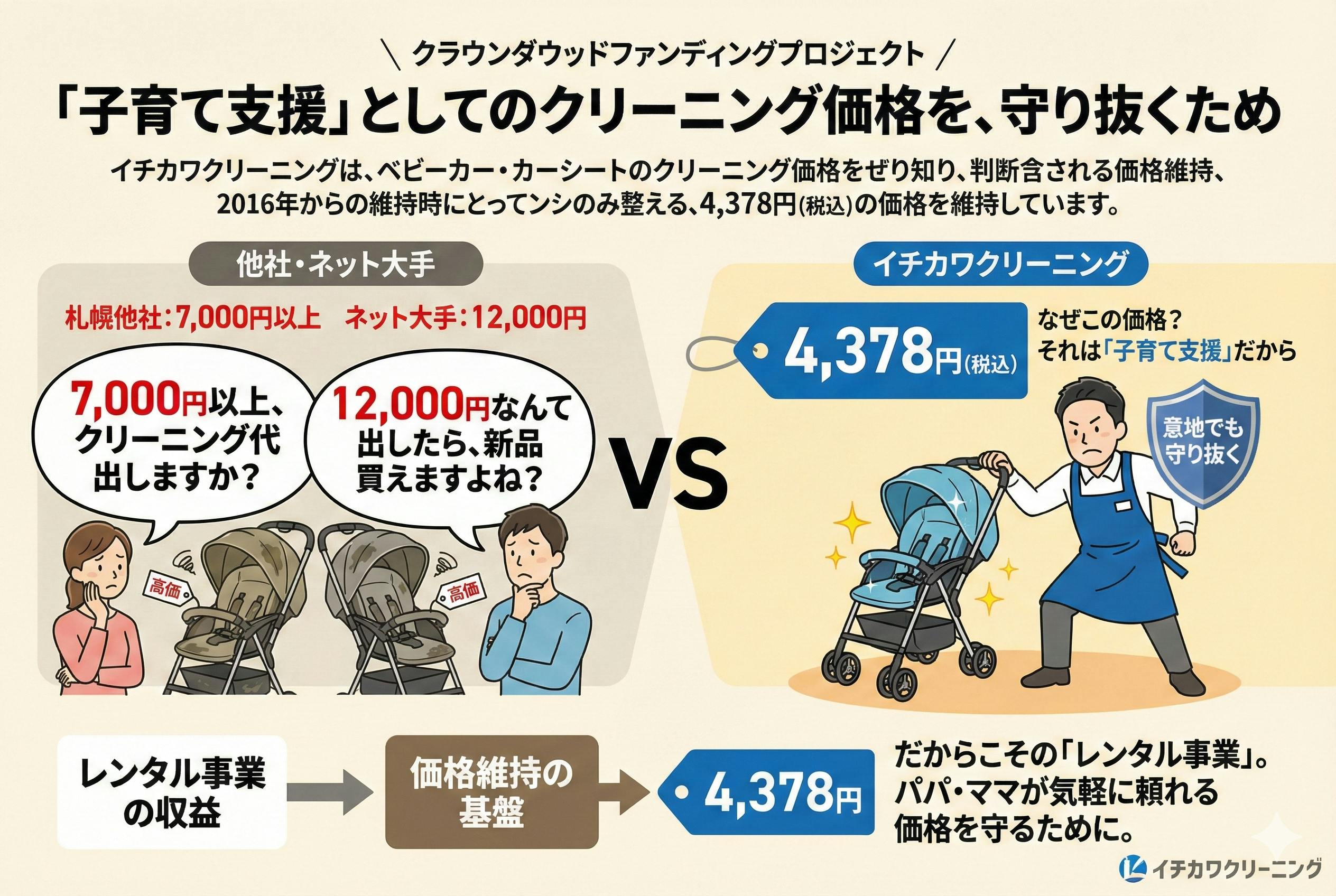 ベビーカー・チャイルドシートクリーニングを札幌でイチ早く2016年に始めたイチカワクリーニングは、サービス開始当時の4,378円(税込)という価格を維持し続けています。
