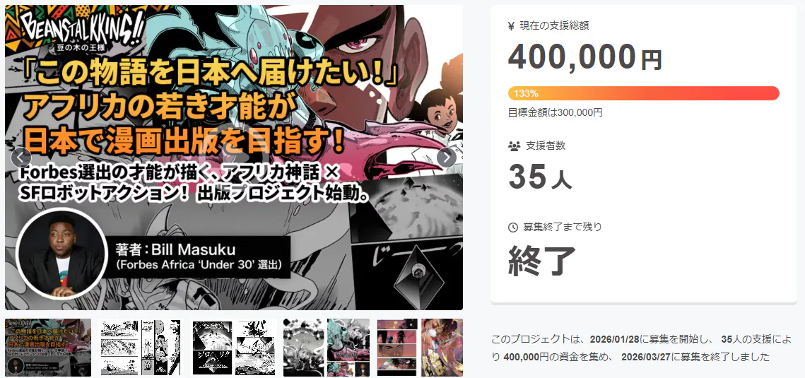 2026/03/31 20:09支援者の皆様へアフリカ出身の漫画家ビル・マスク(Bill Masuku)さんの 電子書籍出版プロジェクトが、 無事に終了いたしました。最終的に目標金額の133%という多大なご支援をいただき、本プロジェクトは大成功を収めることができました!最後までご支援ならびに応援してくださった皆様、本当にありがとうございました。◆ 電子書籍の出版が決定いたしました!今回の成功を受け、 ビルさんの作品を日本の「電子書籍」として 出版することが正式に決定いたしました!アフリカの才能が日本の読者に届けられる第一歩を、 皆様と一緒に踏み出せたことを大変嬉しく思います。◆ ビルさんから皆様へメッセージプロジェクト達成の報告を受け、 ビルさんから皆様へ感謝のメッセージが届いております。"This is the best news! Thank you so much for making this dream come true. I am grateful for the supporters for putting their FAITH into this project. I look forward to the next steps with you as we connect in culture through manga! ARIGATO!"(和訳) 「これは最高のニュースです!この夢を実現してくださり、本当にありがとうございます。このプロジェクトに信頼を寄せてくださった支援者の皆様に感謝しています。漫画を通じて文化をつなぐ次のステップを、皆様と共に進めていけることを楽しみにしています。ありがとう!」◆ 今後のスケジュールとご報告について現在、作品の出版へ向けて制作チームおよびクリエイターとの調整に入っております。リターンのお届け時期やスケジュールにつきましては、改めてこちらの「活動報告」を通じてご案内させていただきます。これから本格的な制作・出版プロセスに入ります。ビルさんの作品が一冊の形になるまでの道のりを、お届けしてまいりますので、楽しみにお待ちいただければ幸いです!◆ INO Fine特設サイトについてなお、INO Fine特設サイトでは 2026年4月27日(月)23:59まで NFTによる支援を引き続き受け付けております。INO Fineでは、電子書籍の売上に基づく印税の一部を受け取れる権利付きのNFTを数量限定で提供しております。ご関心のある方はぜひご覧ください。▶ INO Fine Bill Masuku 特設ページまずはプロジェクト終了の御礼と、 電子書籍化決定のご報告まで。引き続きよろしくお願いいたします! もっと見る